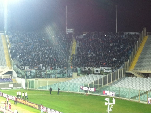 Sono letteralmente scatenati gli oltre 1500 tifosi del Paok che hanno raggiunto in queste ore Firenze per sostenere la propria squadra per una sfida che vale un intero girone. I bianconeri hanno già riempito tutto il settore ospiti del Franchi e da circa mezz'ora stanno incitando i primi giocatori della loro squadra scesi in campo per il riscaldamento pre-partita. Al Comunale questa sera sono presenti talmente tanti tifosi greci che la Fiorentina ha sistemato anche circa 200 sostenitori ospiti nelle poltroncine alla destra della tribuna stampa lato Curva Ferrovia. Definirla trasferta di massa è un eufemismo.