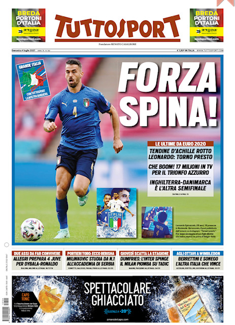 Le prime pagine dei quotidiani sono tutte dell'Italia di Roberto Mancini, autrice, sinora di un bellissimo racconto chiamato Euro2020. La Gazzetta dello Sport sottolinea che i complimenti alla compagine azzurra arrivano da tutta Europa. Ora testa alla gara contro la Spagna. In casa viola, invece, si parla di mercato, con La Nazione che evidenzia l'interessamento della Fiorentina per l'U21 tedesco Dorsch.