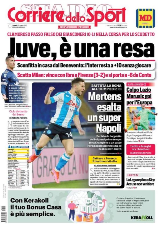 Ecco le prime pagine dei maggiori quotidiani sportivi nazionali, in edicola questa mattina. Tra i temi più caldi, la sconfitta della Juventus col Benevento che allontana i bianconeri dalla vetta della classifica, e la vittoria del Milan a Firenze grazie alla quale i rossoneri continuano la rincorsa all'Inter.
