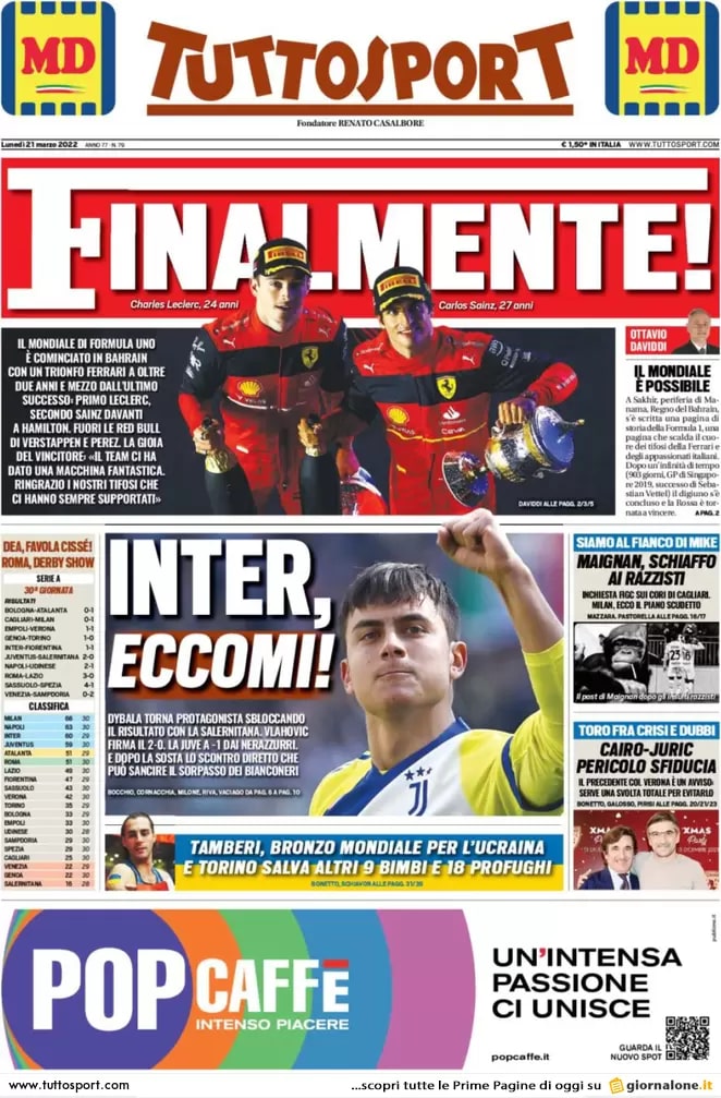Ecco le prime pagine dei maggiori quotidiani sportivi nazionali, in edicola questa mattina.