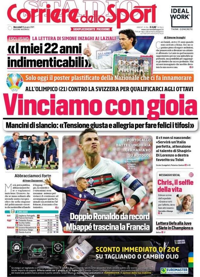 Queste le prime pagine dei giornali sportivi e di quelli politici che si occupano di calcio in edicola oggi. Spazio ovviamente ai successi di Portogallo e Francia nelle rispettive gare di Euro2020 e ai temi legati al match di questa sera dell'Italia contro la Svizzera. Per ciò che riguarda la Fiorentina, focus sul mercato e sulle prime mosse di rivoluzione in società. Ecco le prime pagine dei quotidiani odierni: