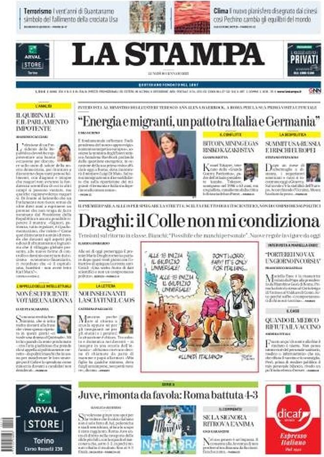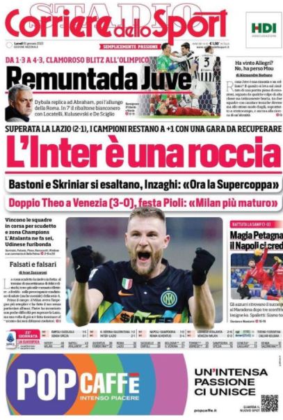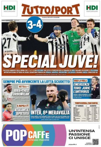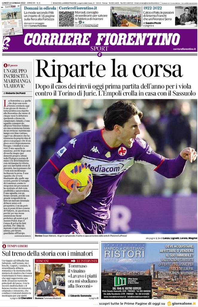 Ampio spazio alle gare giocate ieri in Serie A nel 21° turno di campionato sulle prime pagine dei quotidiani sportivi e di quelli politici che si occupano di calcio. Focus in particolare sulla vittoria in rimonta della Juventus (dove però va registrato il brutto ko di Federico Chiesa) e sul successo faticoso ma quanto mai prezioso dell'Inter contro la Lazio. Approfondimenti poi sulla vittoria del Napoli e sul caos in zona retrocessione. Per cio che riguarda i temi viola, spazio ovviamente alla sfida di questo pomeriggio alle 17 della Fiorentina contro il Torino. Ecco le prime pagine dei giornali in edicola oggi: