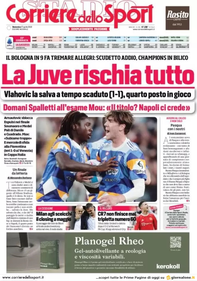 Ampio spazio alla 33a giornata di campionato che si è quasi del tutto esaurita nella giornata di ieri sulle prime pagine dei quotidiani sportivi e di quelli politici che si occupano di calcio. Spazio al pareggio ottenuto in extremis dalla Juventus e alla lotta scudetto che è sempre più nel vivo, in attesa del positicipo di domani sera al Maradona tra Napoli e Roma. Per ciò che riguarda i temi viola, focus sul prezioso successo ottenuto dalla Fiorentina contro il Venezia che ha permesso alla squadra di Italiano di ottenere altri tre punti preziosi in ottica Europa. Ecco le prime pagine in edicola oggi: