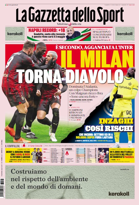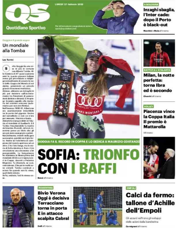 Ecco le prime pagine dei quotidiani sportivi italiani in edicola oggi, lunedì 27 febbraio 2023.