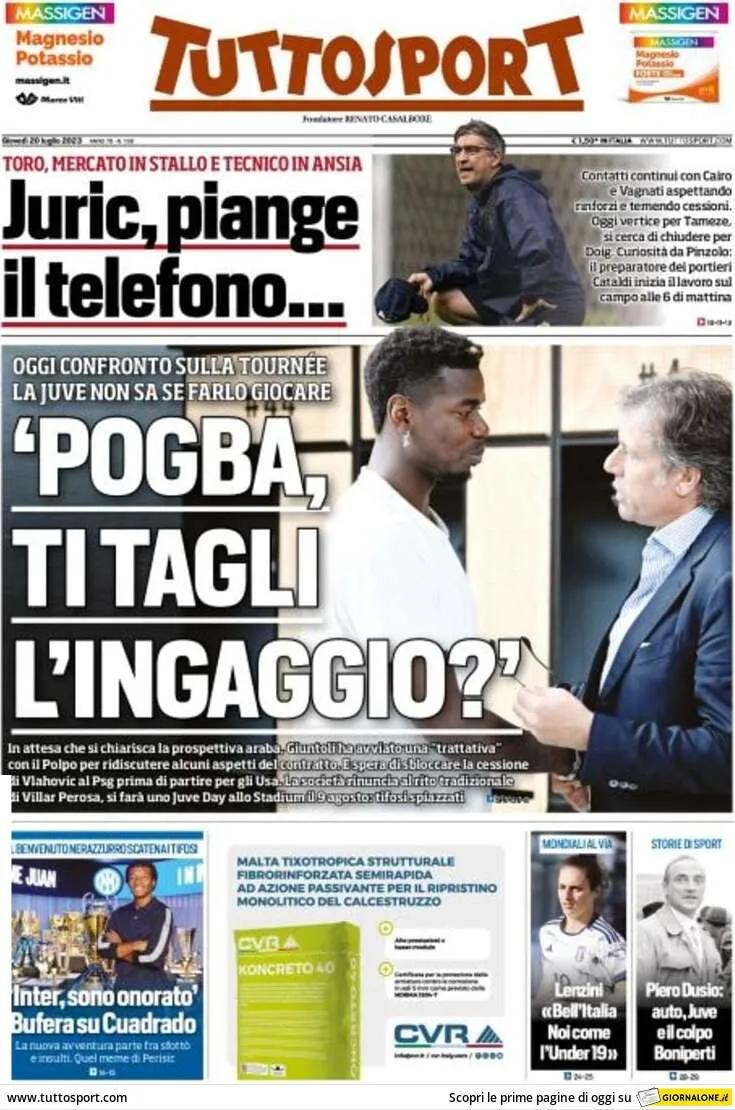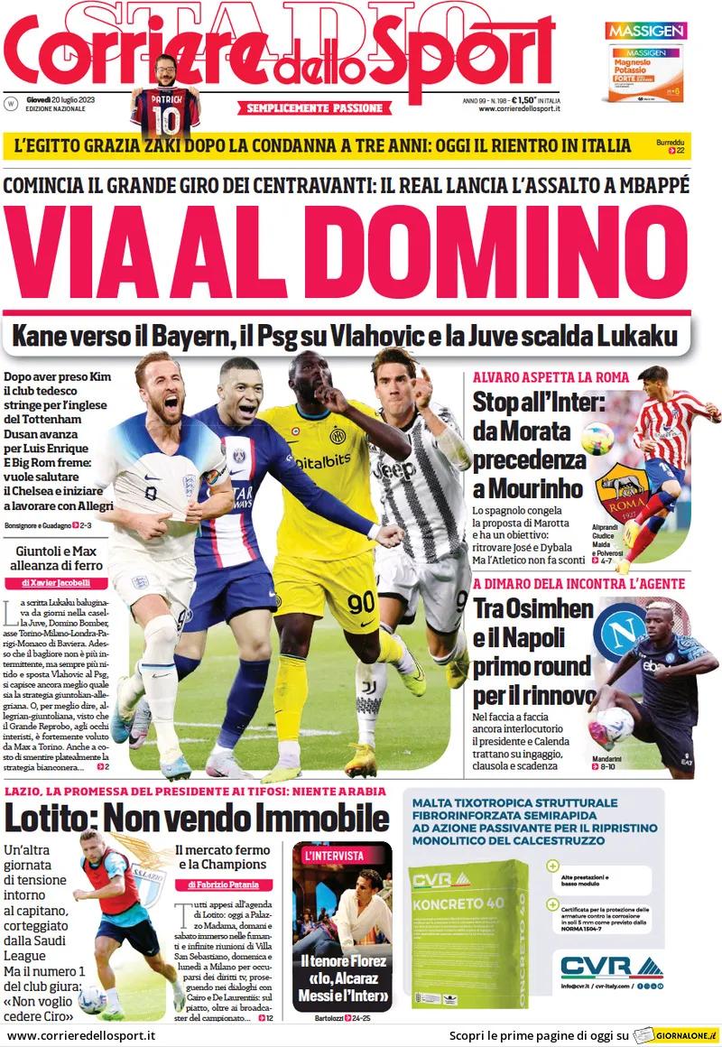 Queste le prime pagine dei maggiori quotidiani sportivi in edicola quest'oggi in Italia, giovedì 20 luglio 2023.