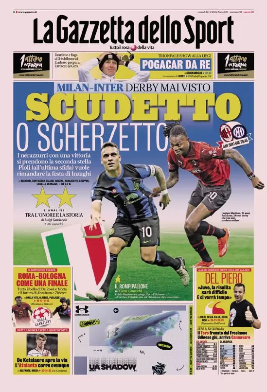 Queste le prime pagine dei principali quotidiani sportivi e locali in edicola oggi, lunedì 22 aprile 2024.