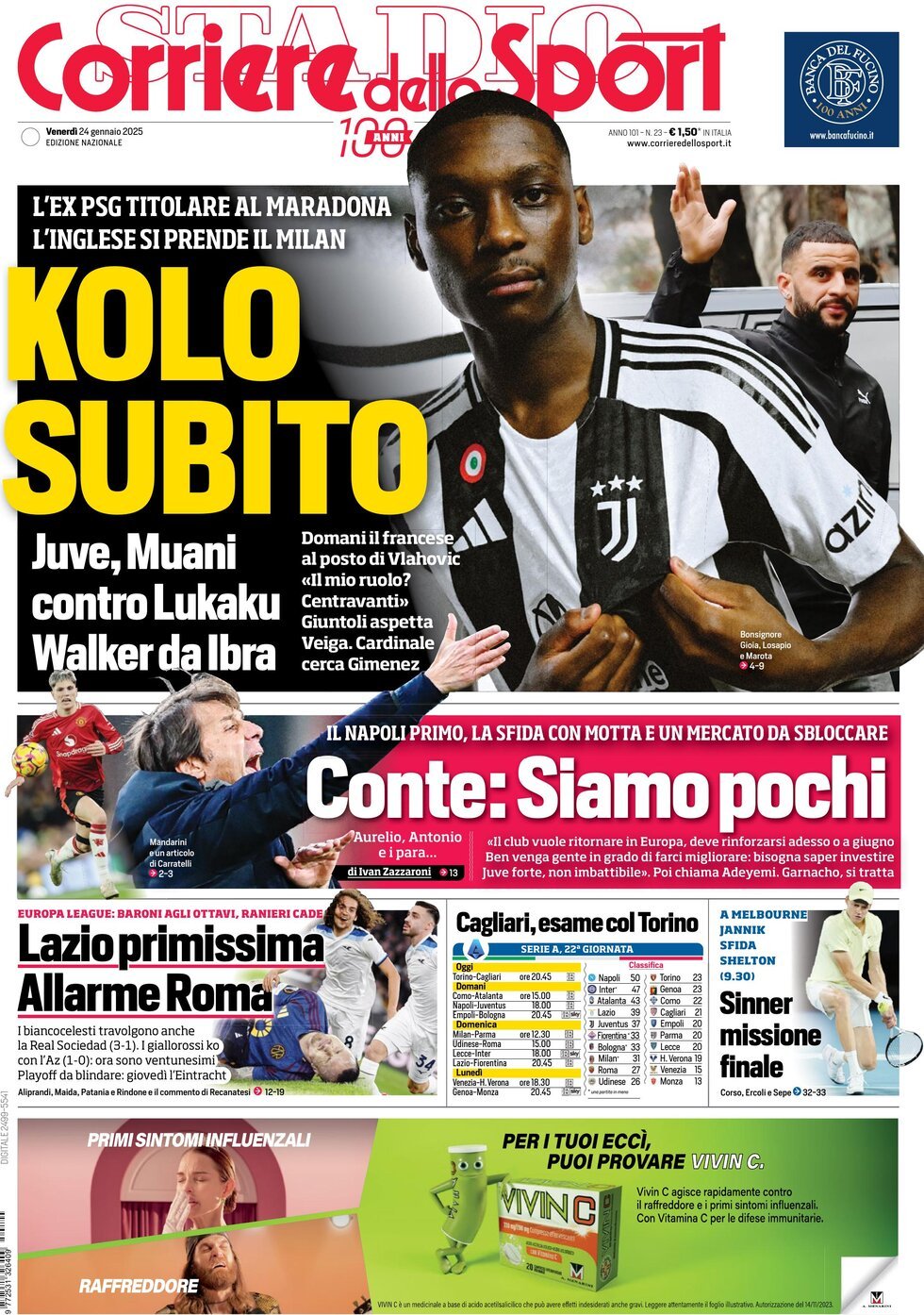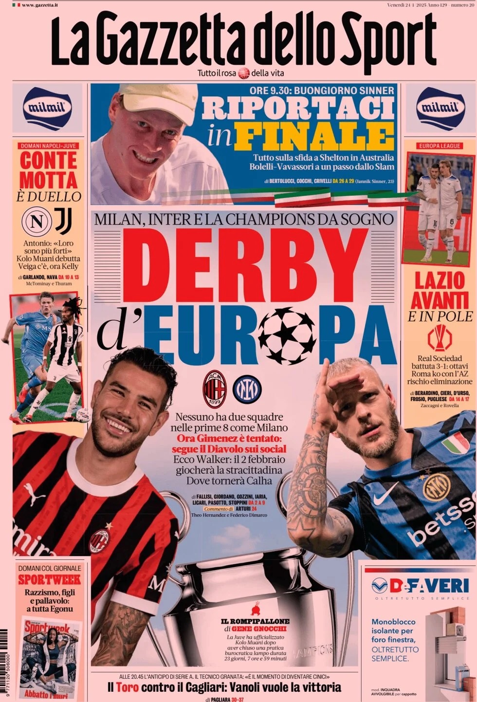 Queste le prime pagine dei principali quotidiani sportivi italiani oggi in edicola, venerdì 24 gennaio 2025.
