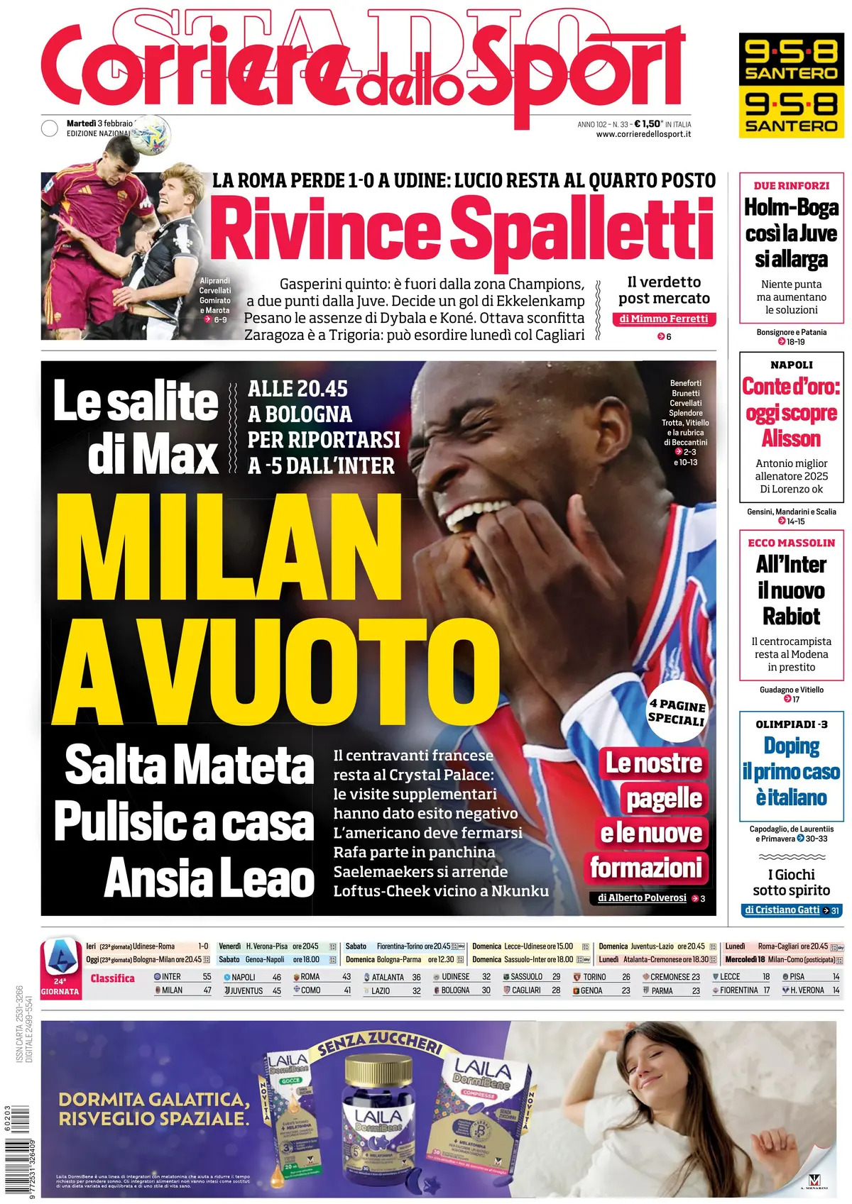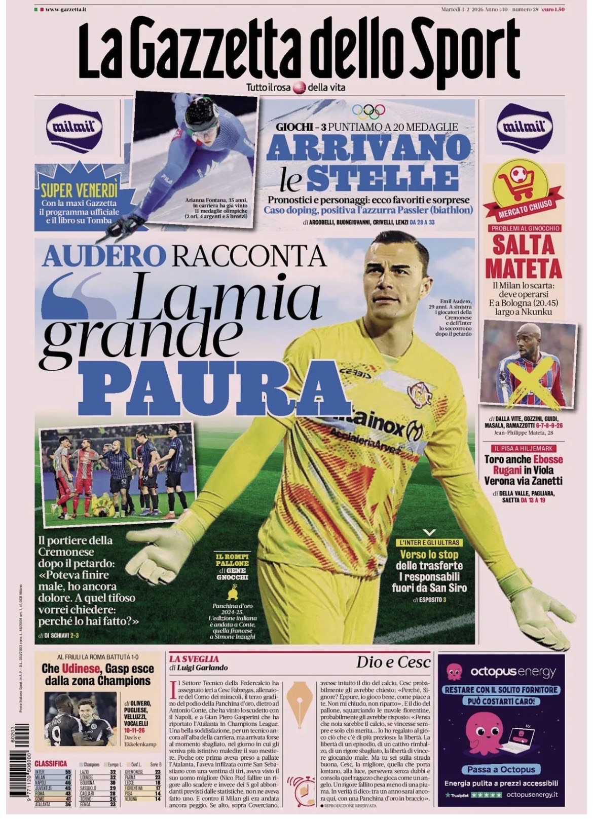 Queste le prime pagine dei quotidiani sportivi in edicola oggi, martedì 3 febbraio 2026.