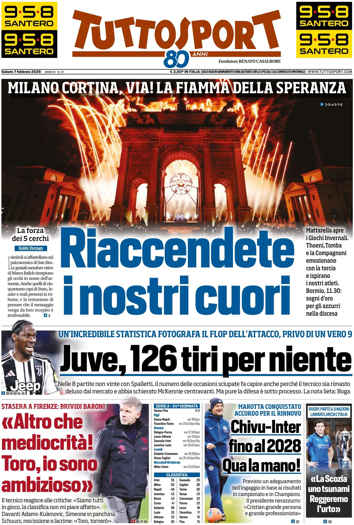 Queste le prime pagine dei quotidiani sportivi in edicola oggi, sabato 6 febbraio 2026.