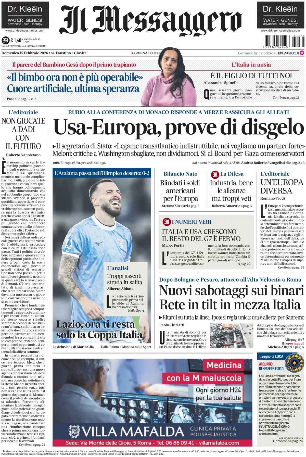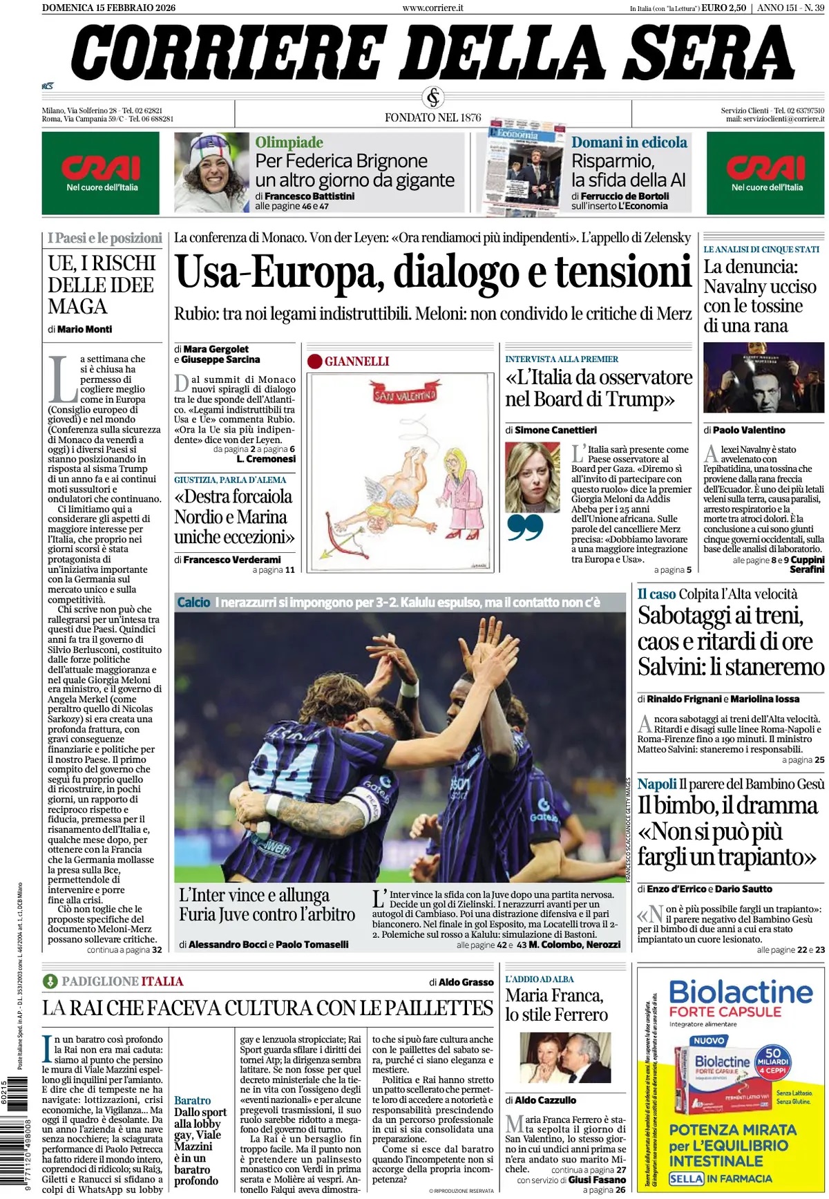 Queste le prime pagine dei quotidiani sportivi in edicola oggi, domenica 15 febbraio 2026.