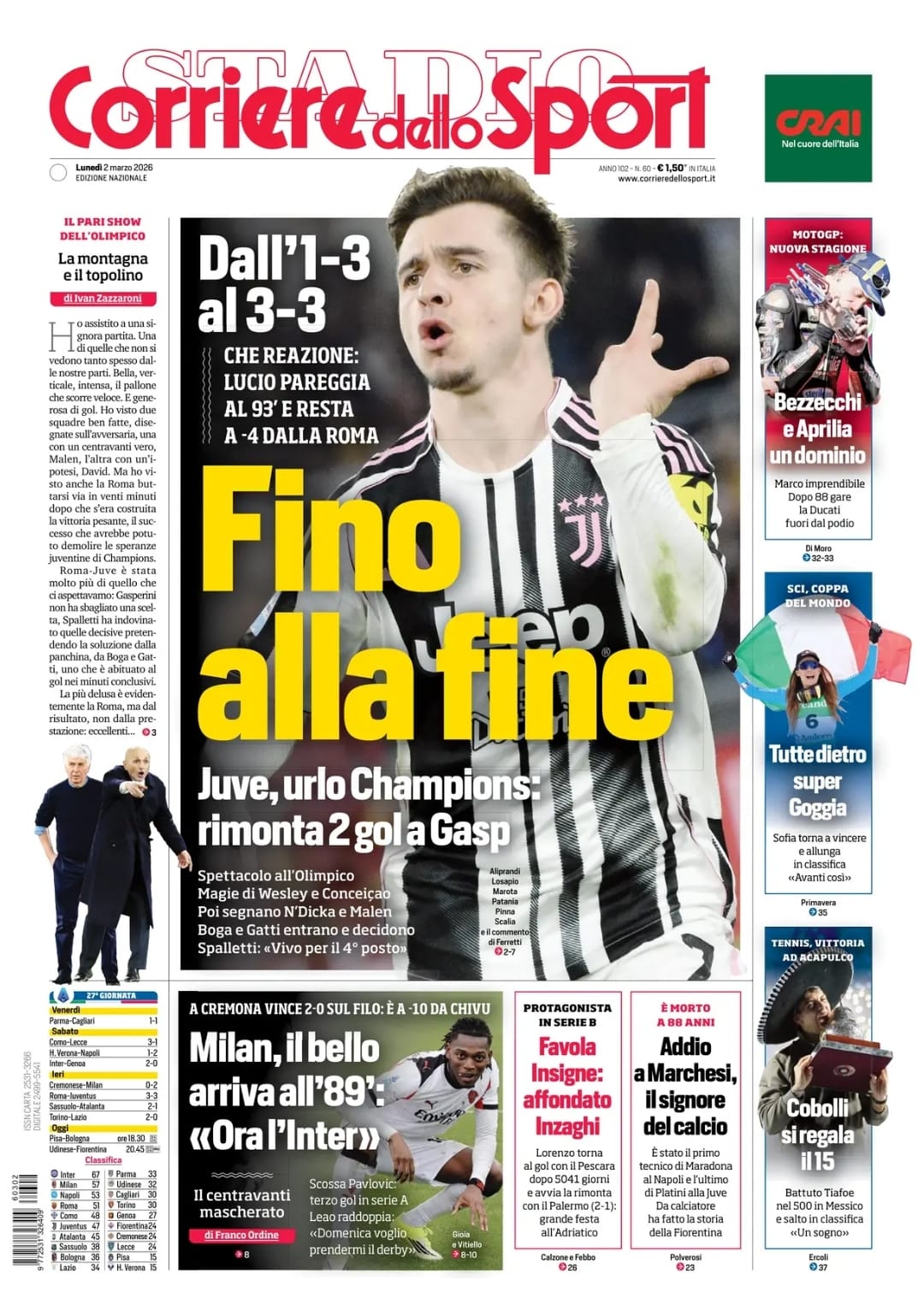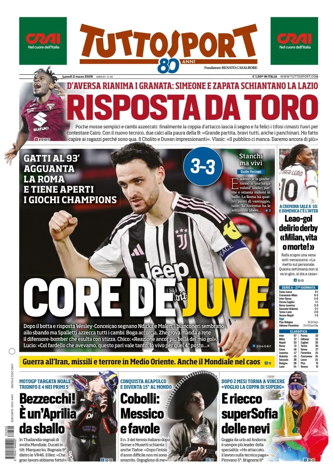 Queste le prime pagine dei quotidiani sportivi in edicola oggi, lunedì 2 marzo 2025.