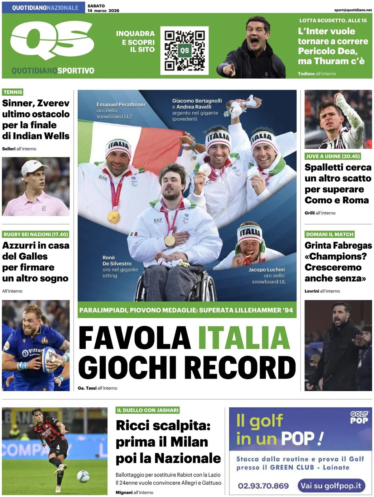 Queste le prime pagine dei quotidiani sportivi in edicola oggi, sabato 14 marzo 2026.
