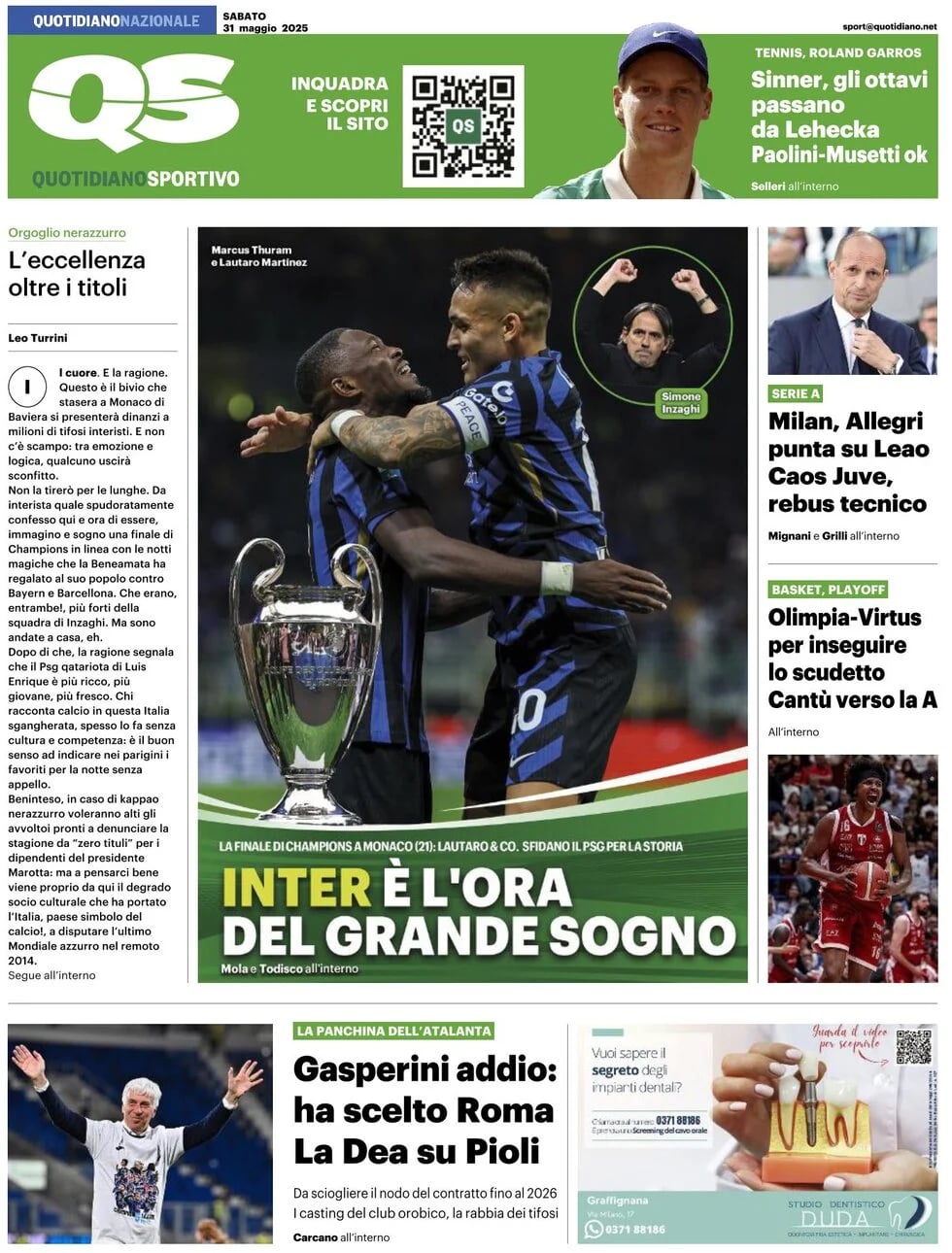 Queste le prime pagine dei quotidiani sportivi in edicola in Italia oggi, sabato 31 maggio 2025.