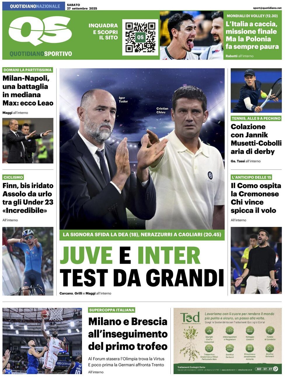 Queste le prime pagine dei quotidiani sportivi italiani di oggi, sabato 27 settembre 2025.