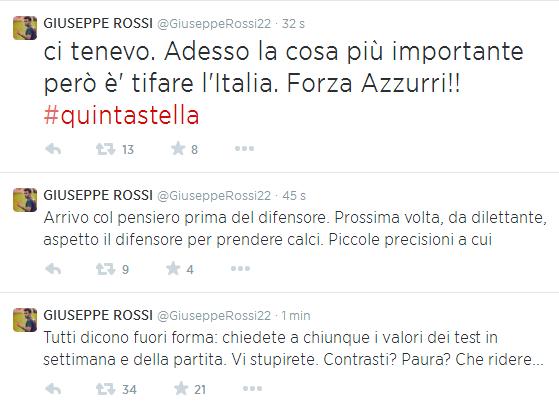 Questi i tweet pubblicati poco fa da Giuseppe Rossi, all'indomani della sua mancata convocazione con la Nazionale italiana per il Mondiale in Brasile: "Tutti dicono fuori forma: chiedete a chiunque i valori dei test in settimana e della partita. Vi stupirete. Contrasti? Paura? Che ridere... Arrivo col pensiero prima del difensore. Prossima volta, da dilettante, aspetto il difensore per prendere calci. Piccole precisioni a cui ci tenevo. Adesso la cosa più importante però è' tifare l'Italia. Forza Azzurri!! #quintastella".