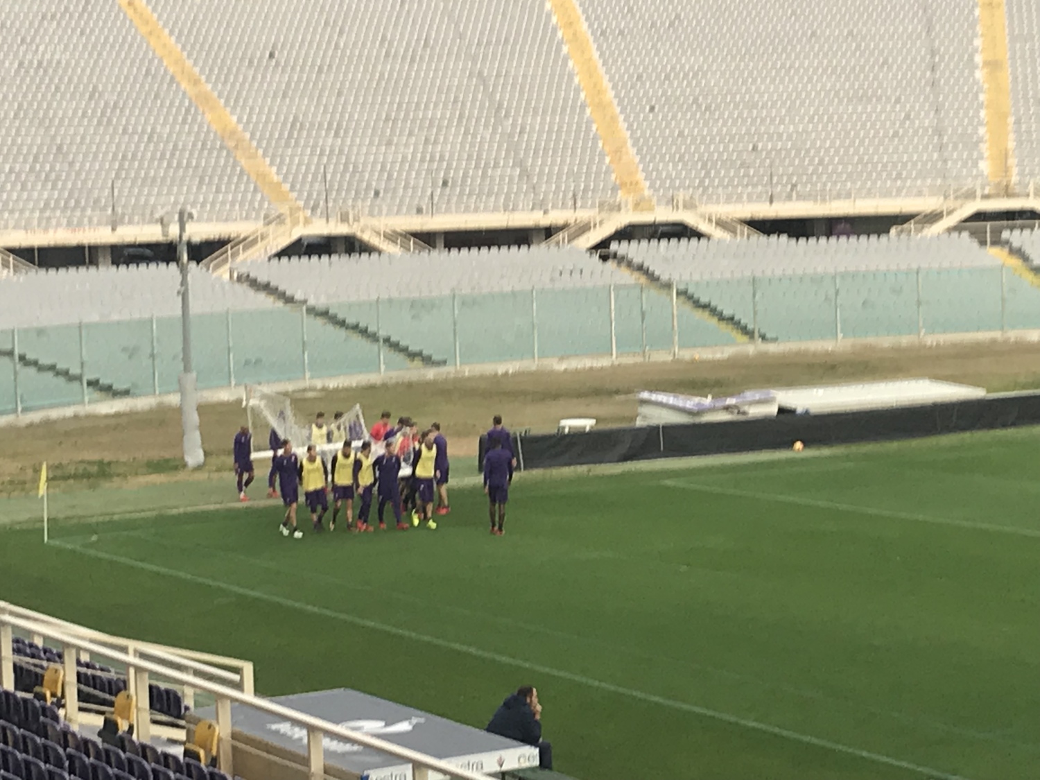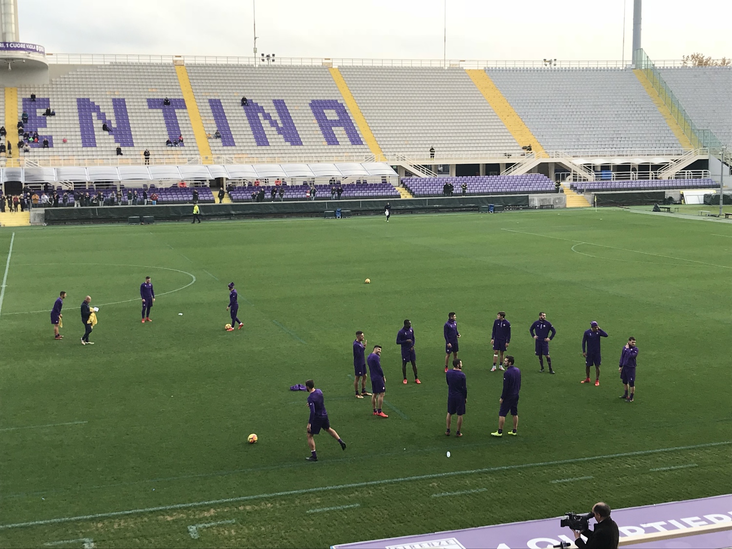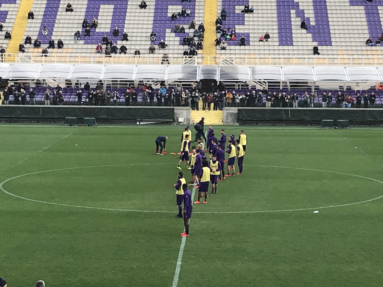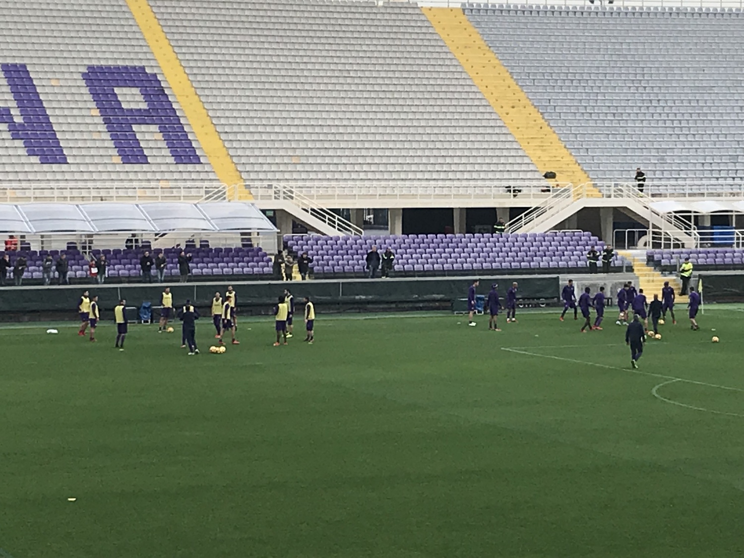 15:21 - I giocatori viola, tra gli applausi dei tifosi, si radunano a centrocampo per iniziare il riscaldamento: corsa e stretching, mentre i portieri dall'altra parte del campo si allenano con esercizi specifici per gli estremi difensore