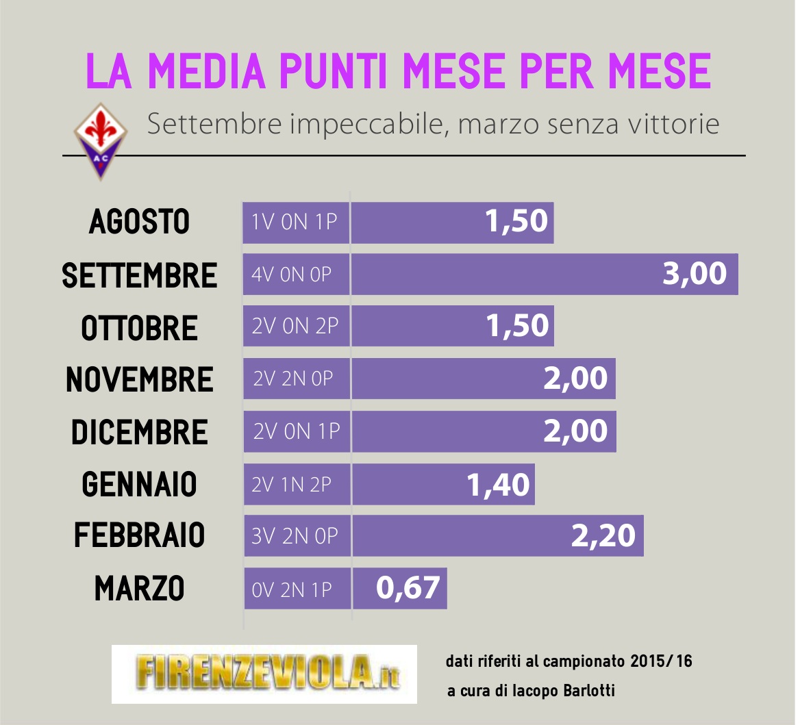 L'inizio 2016, dopo la vittoria di Palermo per la Befana, è invece difficile: la media di gennaio è 1,40 (un pari e due sconfitte su cinque gare). A febbraio, nonostante le gare impegnative con Inter e Napoli, la media risale a 2,20, ma bisogna fare i conti con l'eliminazione dall'Europa League. Infine marzo, il mese più difficile: fra lo scontro diretto con la Roma e le sfide con le ultime della classe (Verona e Frosinone) arrivano 0 vittorie, con una media-punti di 0,67. Segno che i viola devono rialzarsi, ancora una volta, e ripartire. In vista delle ultime otto, decisive, partite della stagione.