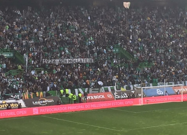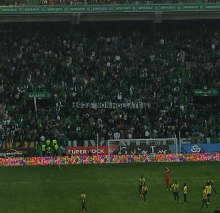 Gli amici si vedono nel momento del bisogno, si sa. I gemellaggi anche. E così in un momento delicato per la Fiorentina ma anche per il gruppo più rappresentativo della Fiesole, 1926, alle prese con daspo e denunce recenti ma intenti comunque a sostenere la squadra, arriva il sostegno dei tifosi dello Sporting Lisbona "1926 Non mollate" si legge in uno striscione. Lo striscione è stato esposto durante la gara del campionato portoghese di ieri Sporting Lisbona-Madeira vinta dai padroni di casa per 2-0.