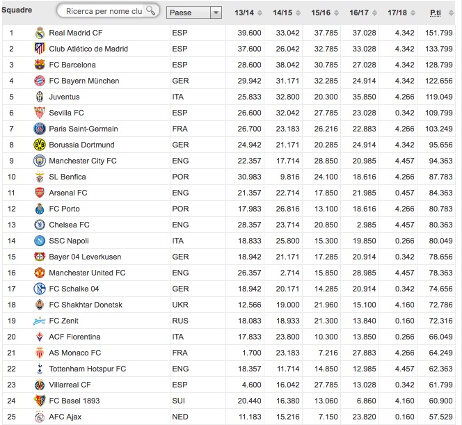 La Uefa ha pubblicato sul suo sito nella giornata di ieri la classifica aggiornata del ranking per club delle ultime cinque stagioni: la Fiorentina si trova al 20° posto in assoluto in Europa con 66.049 punti, terza italiana alle spalle delle sole Juventus e Napoli (negli ultimi anni sempre in Champions). Un ottimo risultato per il club viola, davanti a società di livello internazionale come Monaco, Tottenham, Lione e Roma. Ecco l'immagine della classifica aggiornata: