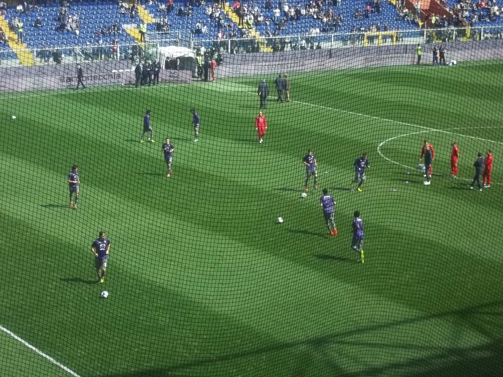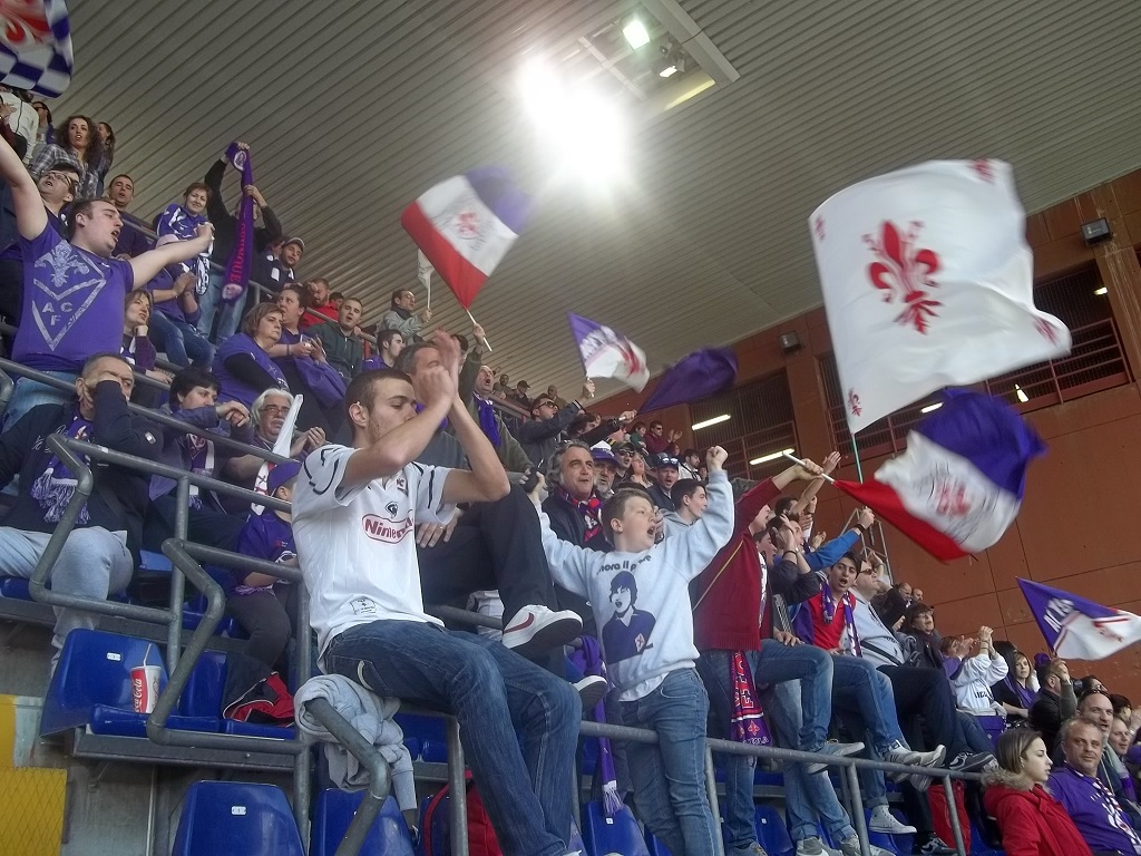 La visuale come sempre non è delle migliori, la rete che divide il settore dal campo rende il tutto più difficile. Un numero esiguo di tifosi è presente anche nella parte centrale della tribuna. Il primo coro di ovazione dei tifosi è all'entrata del portiere Neto, giusto riconoscimento del lavoro svolto dall'inizio del campionato, che ha fatto ricredere anche i più scettici nei suoi confronti. Il boato aumenta con l'entrata della squadra viola, che rimbomba in tutto lo stadio. Al fischio d'inizio, la formazione obbligata, date le date assenze per infortuni e la squalifica di Gonzalo, un 4-3-2-1, con Cuadrado terzino (molti contestano questa scelta) e Matri davanti supportato da Wolski e Ilicic.