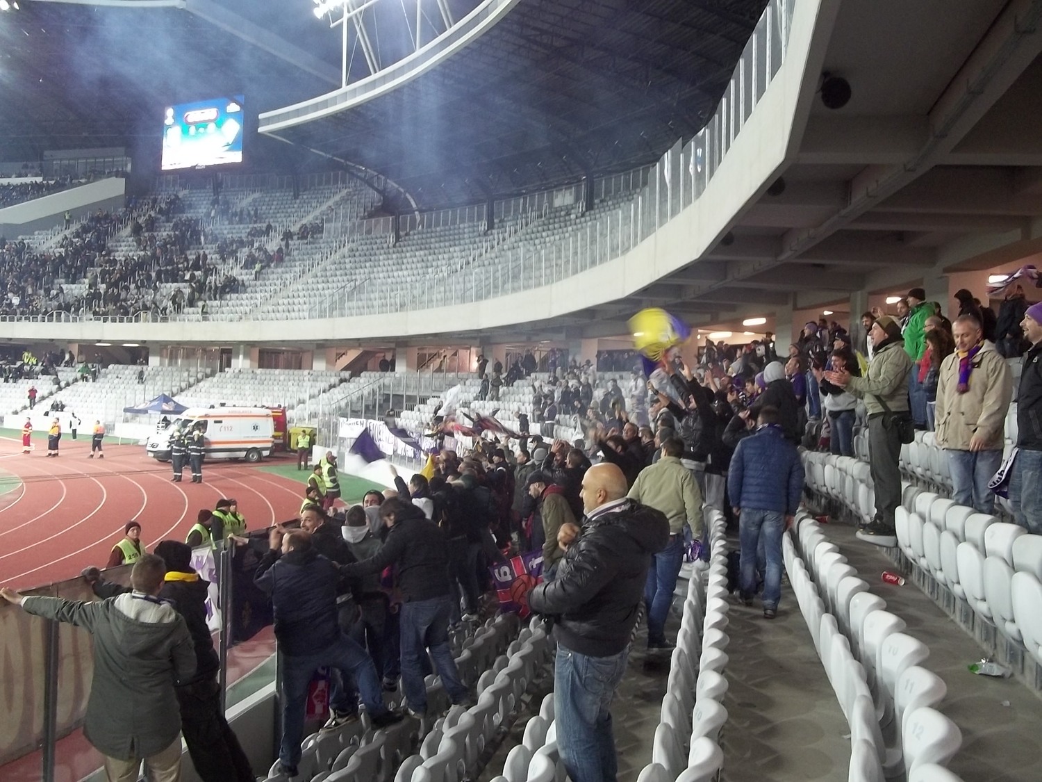 Dopo Milano con il primo esodo del popolo viola, circa 250 sono stati i tifosi che hanno seguito la squadra in Romania. Purtroppo il sorteggio del girone almeno per le distanza logistiche delle città e le difficoltà dei mezzi per raggiungerle non è stato dei migliori, quindi ognuno si è dovuto organizzare autonomamente. La maggior parte ha contenuto i costi del viaggio prenotando con largo anticipo i vari voli low cost, da Bologna e da Bergamo, anticipando la partenza e pernottando nella città rumena. Una cinquantina di audaci divisi in un pulmino da nove (quelli che ci sono ovunque) e una trentina in pullman (organizzato da alcuni club dell'Atf) sono partiti da Firenze hanno percorso autostrade e strade impervie, in 45 ore di viaggio (andata e ritorno) solo per assistere alla partita. I fortunati che hanno vissuto la città di Cluj-Napoca, centro della Transilvania, hanno potuto ancora una volta portare in una città europea i colori viola con orgoglio e lasciare una loro piccola impronta. La città rumena è di quelle che non ci si aspetta, tranquilla, ordinata, il problema della lingua quasi non si avverte, si gira liberamente per le strade del centro con le sciarpe al collo e le maglie viola. Si incontrano amici che si conoscono ma sopratutto si allargano le conoscenze con coloro mai frequentati, ci si organizza nei vari locali, dai pub, alle discoteche, ai ristoranti, ci si scambia le varie esperienze del posto e il giorno della gara, questo nugolo di viola diventa un tutt'uno. Si mangia insieme le specialità del luogo, con il cambio favorevole della moneta rumena (il lei) dove i costi sono davvero irrisori. Si percorre in largo e lungo questa città universitaria, con diverse lingue, culture e religioni, e il pomeriggio della partita attraverso un passa parola i duecento tifosi viola si danno appuntamento in una birreria del centro, diventata "covo dei viola", per andare insieme verso il Cluj Arena Stadium, che si trova adiacente al centro a ridosso di un parco. La distanza è minima, in dieci minuti si arriva a piedi e si resta entusiasti della struttura che ci troviamo davanti. Pochi controlli degli steward, la polizia che rimane quasi ai margini, e verso le 19 locali (alle 18 in Italia), siamo posizionati nel nostro settore, quasi a bordo campo. Sembra di essere in un posto irreale, il resto dello stadio completamente vuoto, e anche ad inizio gara sono circa duemila i tifosi avversari nella parte superiore. Ci si siede nei seggiolini quasi ad assistere ad uno spettacolo teatrale, il clima surreale, al riscaldamento della squadra gli applausi e i nomi scanditi dei vari giocatori si sentono come se fossero accanto, Finalmente la partita, i diversi innesti (dal portiere Munua a Iakovenko) neanche considerati, pensiamo che è una pratica quasi scontata da archiviare, forse anche i nostri ragazzi in campo hanno pensato la stessa cosa, visto che la prima parte della gara viene giocata con sufficienza e poca cattiveria negli ultimi metri. Si sprecano occasioni e così Eric Pereira al 32° porta in vantaggio i rumeni, con il grande entusiasmo di tutta la tifoseria avversaria, supportata in modo ironico dai nostri. Nel secondo tempo si ridisegna la squadra con l'innesto di Borja Valero che cambia letteralmente la partita, insieme al sempre straordinario imprendibile Cuadrado che negli ultimi minuti tira verso la porta e Matos devia in porta per il pareggio. Neanche il tempo di festeggiare che lo stesso Cuadrado passa un assist a Borja Valero che con un diagonale ci porta ai sedicesimi di finale. Ora sì che la nostra festa inizia, con cori, canti, danze, solo ironia, si ripete quasi ossessivamente la nenia dei tifosi del Pandurii. Solo pochi minuti e si esce dallo stadio, i pochi su citati rientrano a Firenze, la maggior parte ripercorre il viale del parco cantando, si ritorna in centro verso i vari locali a cena, a festeggiare fino a tarda notte. Siamo esausti quando il giorno dopo rientriamo in Italia, due giorni vissuti fino all'ultimo respiro a portare in giro i nostri colori, con la passione totale e viscerale che ci contraddistingue ovunque andiamo. La nostra prossima tappa ci porterà in Portogallo, con l'obiettivo di arrivare primi nel girone, noi quelli che siamo sempre al fianco della squadra, saremo di certo a vivere e raccontare la nostra Europa Viola...