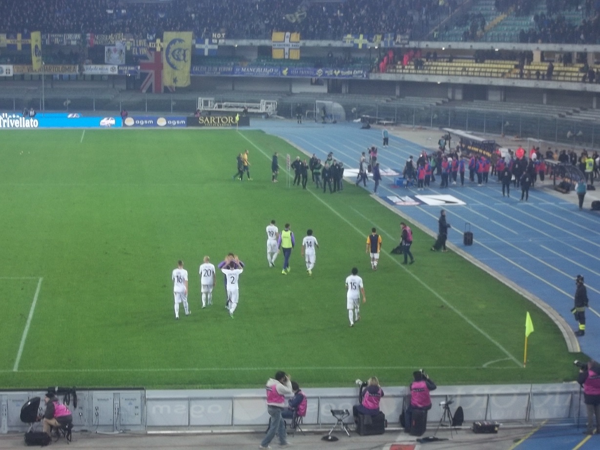 La gioia del colombiano è incontenibile, salta i cartelloni pubblicitari e nella pista di atletica sotto il settore ospiti viene a festeggiare con il resto della squadra che lo segue, mentre Alonso e Pizarro incitano i tifosi. La gara resta aperta ma la Fiorentina sembra amministrare il risultato, il carattere e la determinazione prevale per portare a casa tre punti fondamentali. Le sostituzioni di Vargas per Alonso, di Joaqiun per Babacar e di Gomez (ancora una volta sostenuto con cori dai tifosi) per Kurtic, cambiano poco l'assetto della gara. Al fischio finale i tifosi si scambiano i cori "Verona Verona" e "Viola Viola". La prima trasferta in sette giorni viene archiviata. Una parte della tifoseria è già mentalmente in movimento verso la Francia. Senza respiro, fino ad arrivare a Cagliari domenica prossima. Questa è la risposta dei tifosi.