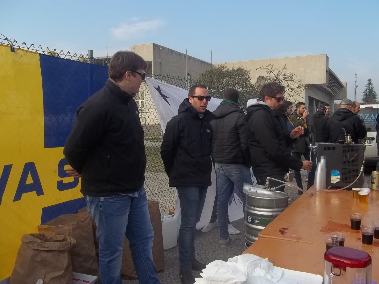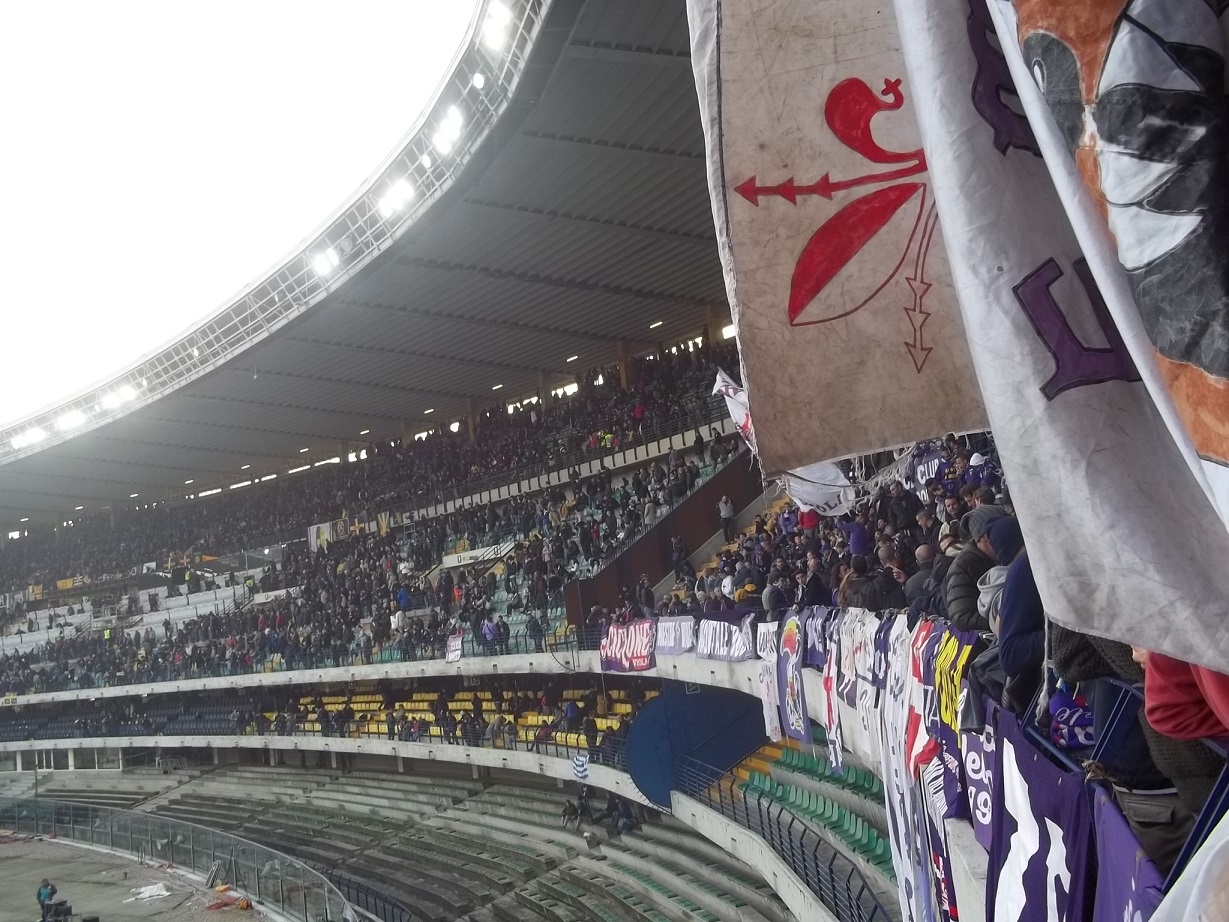 La trasferta è di quelle giuste, nessun pericolo per l'ordine pubblico, la gara contro il Verona è una festa fuori e dentro lo stadio. Dato lo storico gemellaggio duraturo e mai incrinato negli anni, e l'orario nella fascia pomeridiana, si assiste al primo esodo viola della stagione, con la presenza sugli spalti di circa duemila tifosi viola non solo nel settore adibito agli ospiti. La maggior parte decide di utilizzare i mezzi propri, anche per facilitare il ritorno, alcuni club in pochi pullman. Intere famiglie al seguito, tanti bambini che si scambiano cappellini e sciarpe. Il primo appuntamento con gli amici del Verona e nel parcheggio dello stadio, stendardi sciarpe e bandiere dei due diversi colori si mescolano mentre si consuma un panino e un bicchiere di vino e birra, offerto dai "padroni di casa". Insieme le due tifoserie un'ora prima della gara posizionano nei vari settori striscioni e bandiere.