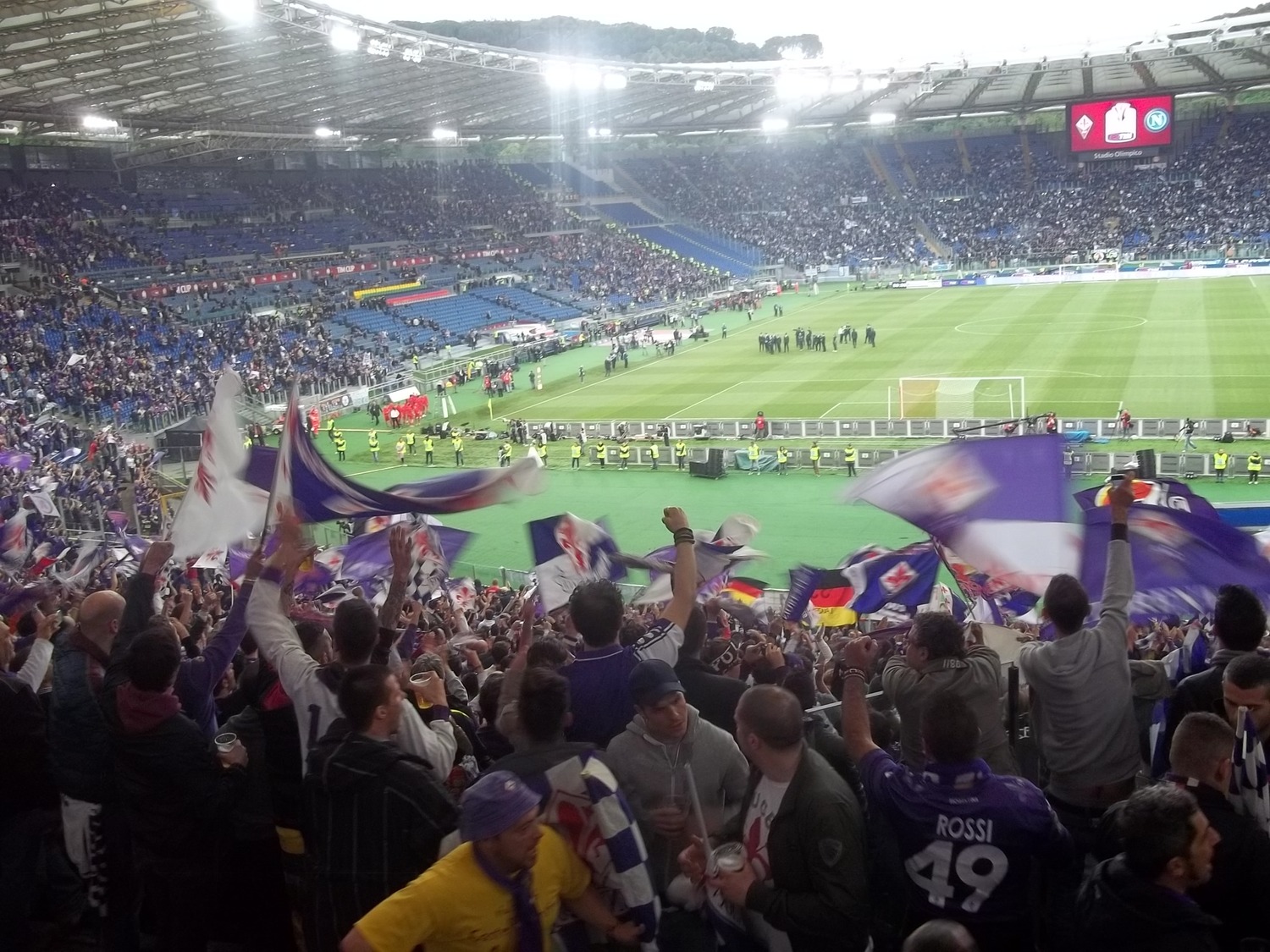 Le ore di attesa nel parcheggio alle porte della capitale per i primi nuclei sembrano infiniti, in realtà i fortunati che arrivano nella prima trance si ritrovano nel parcheggio adiacente allo stadio verso le 17.30. Un fiume di persone si incammina verso la Curva Sud, una processione di bandiere, striscioni e sciarpe, con cori e slogan e tanta allegra confusione. Finalmente si vanno ad occupare le varie postazioni del settore, nessun problema ai tornelli, tutto sembra presagire ad una serata tranquilla. Mancano ancora tre ore circa dall'inizio della gara, si comincia a delineare la coreografia preparata, vengono distribuite bandierine viola, rosse e bianche. Poi iniziano i primi messaggi di coloro ancora bloccati all'ingresso della città, sembra che all'esterno ci siano dei disordini tra opposte tifoserie, ma tutto è confusionario ed incerto. Si resta in apnea per interminabili minuti, le notizie che arrivano sono drammatiche, qualcuno dei nostri pullman in mezzo a quelli partenopei, senza scorta, rischiano per la loro incolumità fisica.