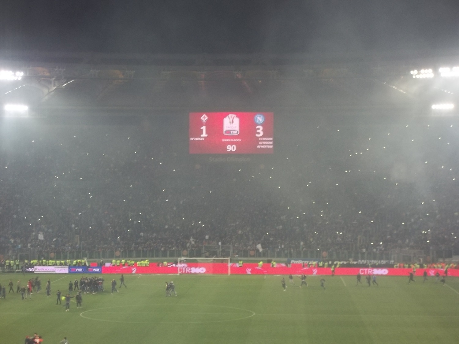 Nel secondo tempo il tifo ritorna alla sua normalità, anche per l'entrata in campo di Pepito Rossi che mette tutti d'accordo. Il goal sbagliato sotto porta da Ilicic che forse riaprirebbe la gara, porta allo sconforto assoluto. Poi lo scempio finale, l'invasione di campo dei partenopei, che hanno il tempo di sbeffeggiare la tifoseria viola sotto il settore, senza che nessuno intervenga. Un encomio particolare ai viola che non cedono a queste ennesime provocazioni, e che non possono fare altro che uscire dallo stadio con l'amarezza e la tristezza nel cuore. La premiazione viene ritardata, epilogo di un qualcosa di incredibile, oltre il danno anche la beffa finale. Quando le due squadre tornano in campo, pochi tifosi restano nel settore a loro riservato per assistere alla consegna della medaglietta di consolazione verso i ragazzi viola, le lacrime scendono da sole. Si evita di vedere i festeggiamenti bianco azzurri.