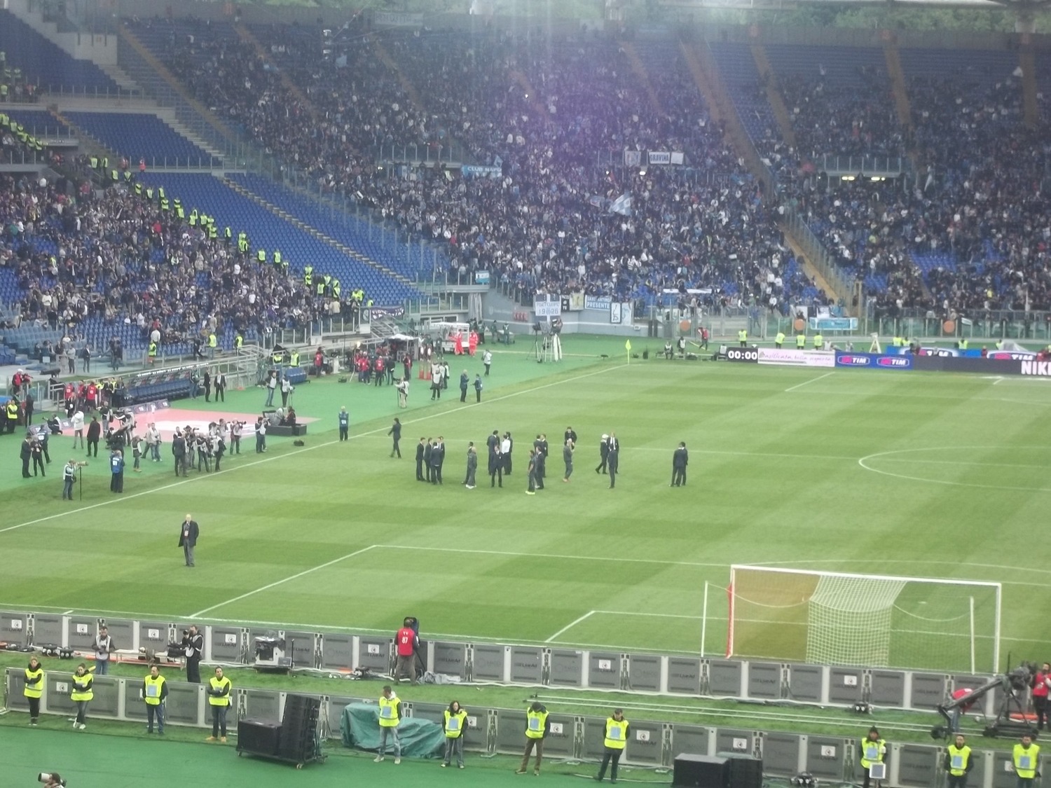 Sugli spalti si aspetta impotenti, nel frattempo sembra che la curva non riesca a contenere il numero eccessivo dei tifosi che arrivano in massa. Al riscaldamento delle squadre tutto sembra rientrare, ma poco prima della gara, la notizia è di quelle da shock, si decide di togliere tutti gli striscioni, per rispetto verso un tifoso partenopeo che nei tafferugli avvenuti fuori dallo stadio è in condizioni critiche. Sono le 20.30, nessun comunicato, tanta concitazione a bordo campo, non si hanno notizie certe, neanche tramite le televisioni che da casa ci tengono in continuo aggiornamento. L'ora d'inizio è ormai passata, si rischia di non giocare la gara, nel frattempo nella curva avversaria una serie di petardi e fumogeni sono lanciati in campo, dove si trovano molti steward e pompieri, non si riesce a capire cosa succede.