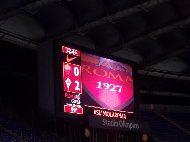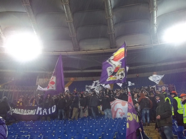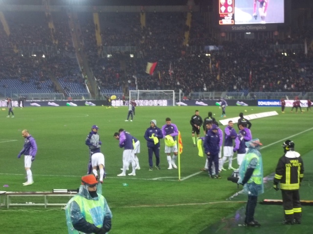 Intorno alle 20.00, ancora perquisizioni a tappeto degli steward davanti e dentro i tornelli, e finalmente ognuno può posizionarsi all'interno del settore ospiti, davanti allo scenario imponente dell'Olimpico. I tagliandi venduti sono in tutto 330, ai quali si sommano quelli dei diversi gruppi arrivati dal Lazio, per una stima di circa 400 tifosi presenti. La pioggia incessante caduta dal pomeriggio continua per tutta la gara, e anche se l'Olimpico è coperto in tutti i settori, il vento la spinge verso la gradinata tale da infradiciare la maggior parte dei presenti. Poi l'adrenalina sale all'ingresso delle squadre, la formazione è quella scontata, il modulo del 3-5-2, con Tatarusanu tra i pali, Savic al centro della difesa insieme a Tomovic e Basanta, a centrocampo Joaquin, Badelj, , Pizarro , Borja Valero, Pasqual, Diamanti in supporto di Gomez. Nella prima fase di gioco i ritmi sono compassati, ma la Roma spesso pericolosa si porta verso la porta di Tatarusanu, accanto al settore ospiti. Il primo tiro è dell'ex di turno Ljajic fuori di poco, di Naiggolan parato e di Peredes alto.