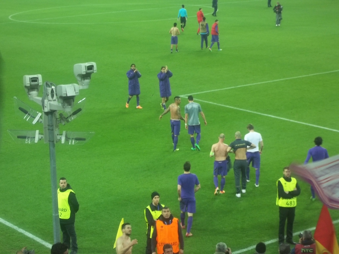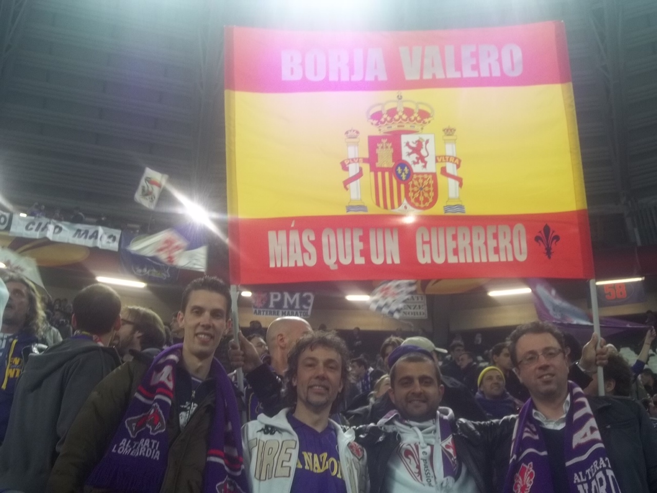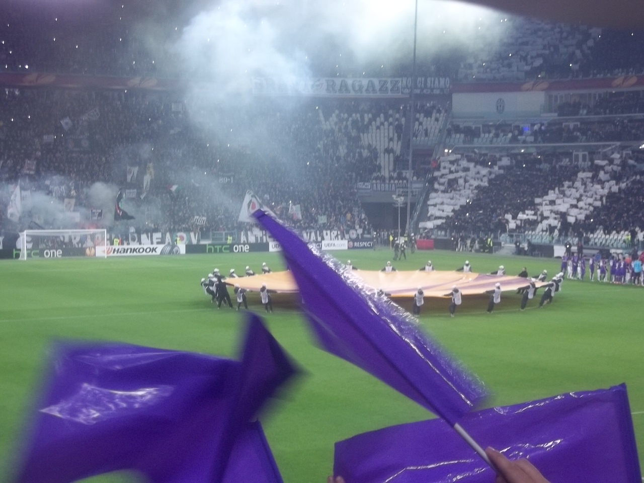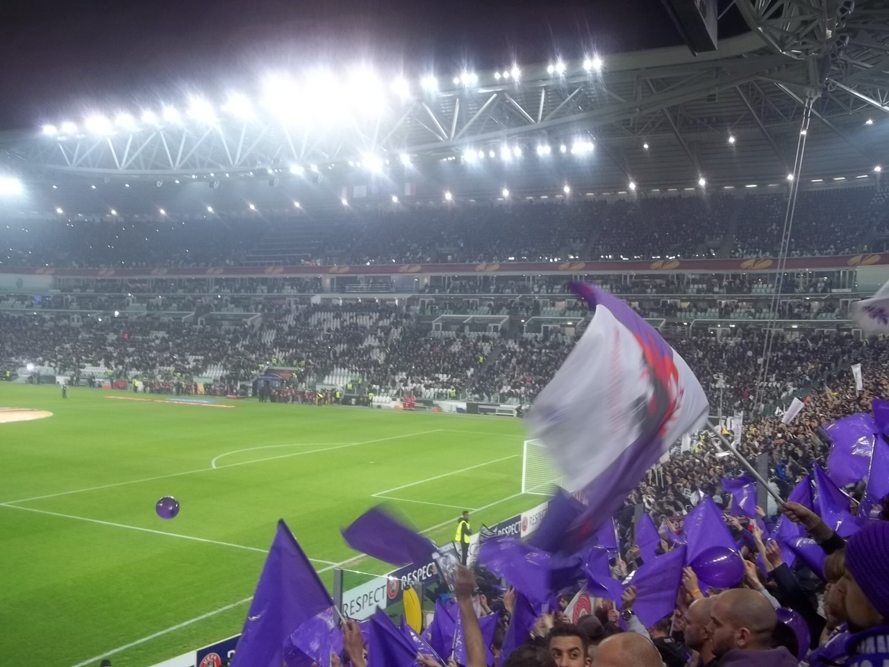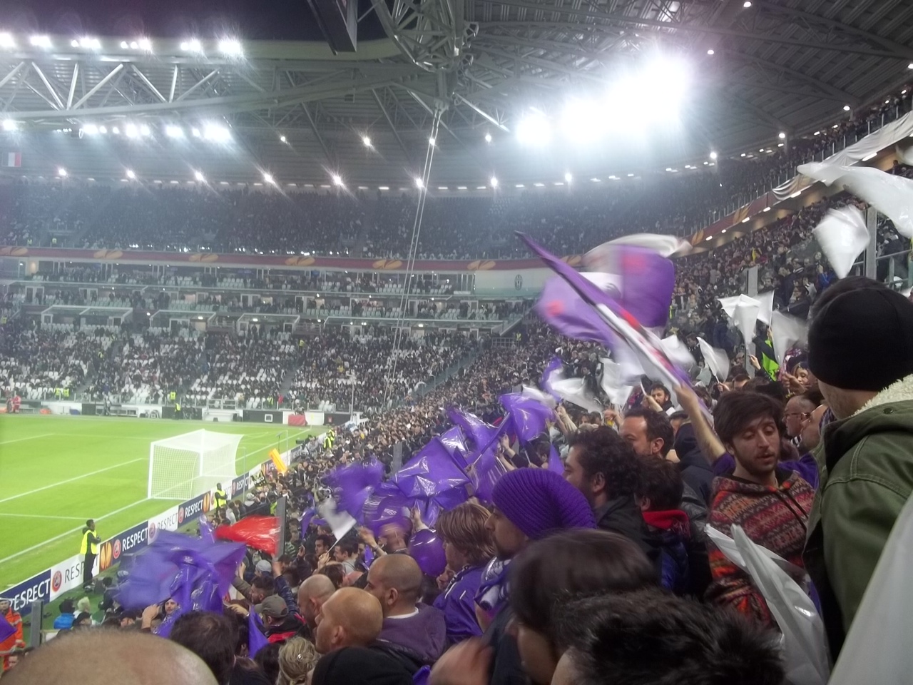 Sono trascorsi solo tre giorni dalla sfida di campionato contro la Juve e per uno strano gioco del destino siamo costretti a ritornare nel solito stadio, per l'ottavo di Europa League. La partita così come tutte le sfide contro la nostra nemica di sempre assume mille significati, ma per molti una rivincita che si stava aspettando da oltre vent'anni. La tifoseria è mobilita dal momento di questo amaro sorteggio, ed i tagliandi del settore ospiti, poco più di 2000, vanno ad esaurirsi in pochissimi giorni. Data e risaputa la rivalità calcistica, la maggior parte usufruisce dei tantissimi pullman organizzati dalle associazioni del tifo, anche i singoli club si spostano con questo mezzo. Un esodo che inizia all'ora di pranzo di un giorno primaverile, una carovana di 45 pullman, i gruppi di sempre, ma tantissimi che per la prima volta sono entrati nello Juventus Stadium. Le ore di viaggio sembrano infinite, la paura e la preoccupazione si avverte ma si cerca di non esprimerla. Alla barriera della città piemontese, come al solito, i controlli delle forze de l'ordine, che convogliano i pullman a dieci alla volta verso lo stadio. Sono le 19.30 quando il primo convoglio si ritrova nel parcheggio dello stadio, i controlli sono meno accurati rispetto a domenica scorsa, così da poterci posizionare nei due anelli del settore ospiti in breve tempo. Le scaramucce verbali con i tifosi juventini adiacenti, fanno quasi sorridere anche gli steward, tutto nella norma. I primi cori per Neto, ma la voce si amplifica all'uscita della squadra viola. L'adrenalina sale, la tensione palpabile, la posta in palio vale quanto tutta una stagione. Come d'incanto mentre parte la sigla dell'Europa League, tutto il settore si colora di bandierine rosse, bianche viola, contornate da palloncini, sciarpe e bandiere che fanno da cornice ad una coreografia da brividi. La formazione viola è un 4-3-2-1, qualcuno storce il naso, per l'utilizzo di una sola punta, ma purtroppo le considerazioni sullo schema tattico si perdono dopo pochi minuti, tre per la precisione, quando Vidal porta in vantaggio i bianconeri. Si resta quasi tramortiti, sommersi dalla bolgia dell'intero stadio. La difesa arranca in varie occasioni, Matri non incide e l'unica occasione viola è un tiro di Mati Fernandez respinto da Buffon. Neto è determinante sul colpo di testa di Vidal che più tardi colpisce la traversa e ci fa tremare. A fine tempo la Fiorentina cresce e Borja Valero, capitano della giornata, manda di poco a lato. Nell'intervallo siamo distrutti, ma la speranza di portare un risultato utile non ci abbandona un istante, qualcuno addirittura fa un fioretto. La ripresa è una bolgia viola, si incita senza tregua una squadra che ha bisogno del nostro sostegno. Le prime sostituzioni di Mati (infortunato) per Ambrosini, Matri per un super osannato Gomez e Vargas per Aquilani, non cambiano l'assetto tattico, ma sembrano dare più forza alla squadra. Al 79° da un lancio di Ilicic, fino a quel momento non esaltante, viene stoppato da Gomez, che spinto dalle nostre duemila voci, controlla da campione e con un perfetto diagonale gonfia la rete (opposta al nostro settore) e manda in estasi tutta la tifoseria viola. Si urla come ossessi, la rabbia esplode in gioia infinita, un groviglio di abbracci per alcuni minuti, indescrivibili, unici. Il resto dello stadio ammutolito, i cori viola rimbombano ancora più forti, le azioni si susseguono, le ultime emozioni su un tiro di Pogba di poco fuori, che ci blocca il respiro, ma si rischia di vincere prima con un destro dalla distanza di Borja Valero, in angolo e subito dopo un sinistro di Vargas da fuori area mandato sempre in angolo da Buffon. Tre minuti di recupero, e finalmente la gioia che può esplodere in tutte le manifestazioni. Cantare nello stadio avversario "tutti a casa olé" non ha prezzo, una soddisfazione totale. Il capitano Borja Valero che porta a festeggiare sotto il settore tutta la squadra, con il lancio delle maglie, il coronamento di una serata speciale. Mentre in pochi minuti si svuota lo stadio, restiamo un'ora e un quarto prima di ripartire, ma nel totale delirio. Tra sette giorni si replica con il ritorno al Franchi, sarà un'altra battaglia, ma la luce nei nostri sguardi sono quelli di coloro che hanno vissuto qualcosa di speciale, in questa notte fantastica...