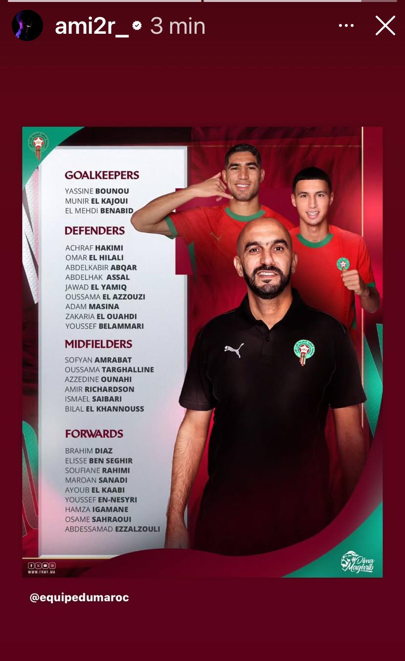 Amir Richardson convocato dal Marocco. Il centrocampista della Fiorentina ha postato su Instagram una storia che mostra le convocazioni del ct Walid Regragui nelle quali figura anche lui. Il Marocco sarà impegnato il 6 giugno contro il Madagascar per la Coppa COSAFA e il 7 e 10 giugno in amichevole contro Tunisia e Benin. Di seguito la foto che ritrae la storia pubblicata su Instagram dal calciatore classe 2002 arrivato la scorsa estate dal Reims: