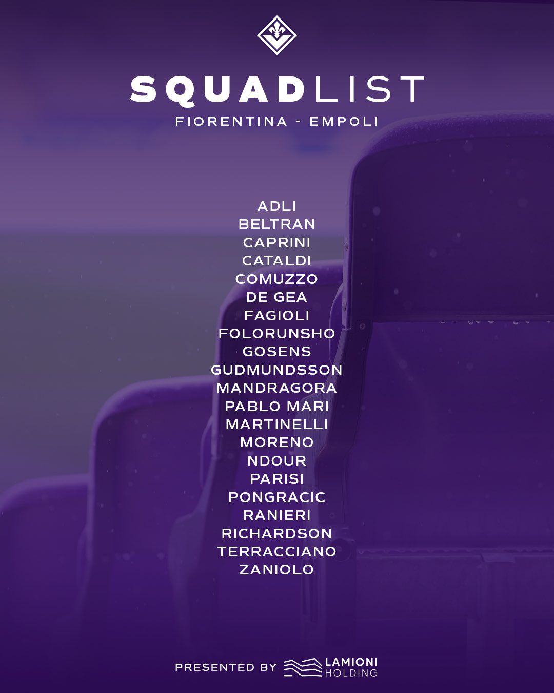 Con un annuncio via socia arrivato in questi istanti, la Fiorentina ha reso noto l'elenco dei suoi convocati per la sfida di domani pomeriggio contro l'Empoli. Assente ancora Colpani così come Kean e Dodo. Presente il giovane Caprini. Ecco nella foto sottostante l'elenco completo: