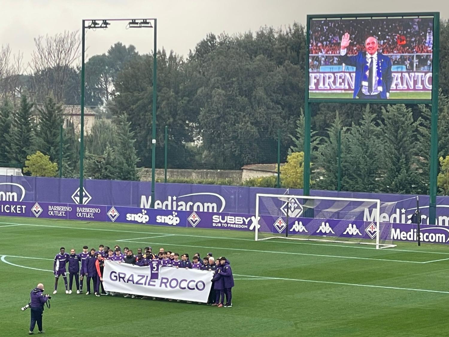 La Fiorentina Primavera, in campo in questo momento al Viola Park per la 22^ giornata di campionato contro il Genoa, ha voluto rendere omaggio prima del fischio d'inizio della partita al presidente viola Rocco Commisso, scomparso all'età di 76 anni una settimana fa. I ragazzi di Daniele Galloppa si sono recati in gruppo in campo e hanno esposto uno striscione in memoria del patron viola con sopra scritto "Grazie Rocco". Queste le immagini direttamente dal Viola Park: