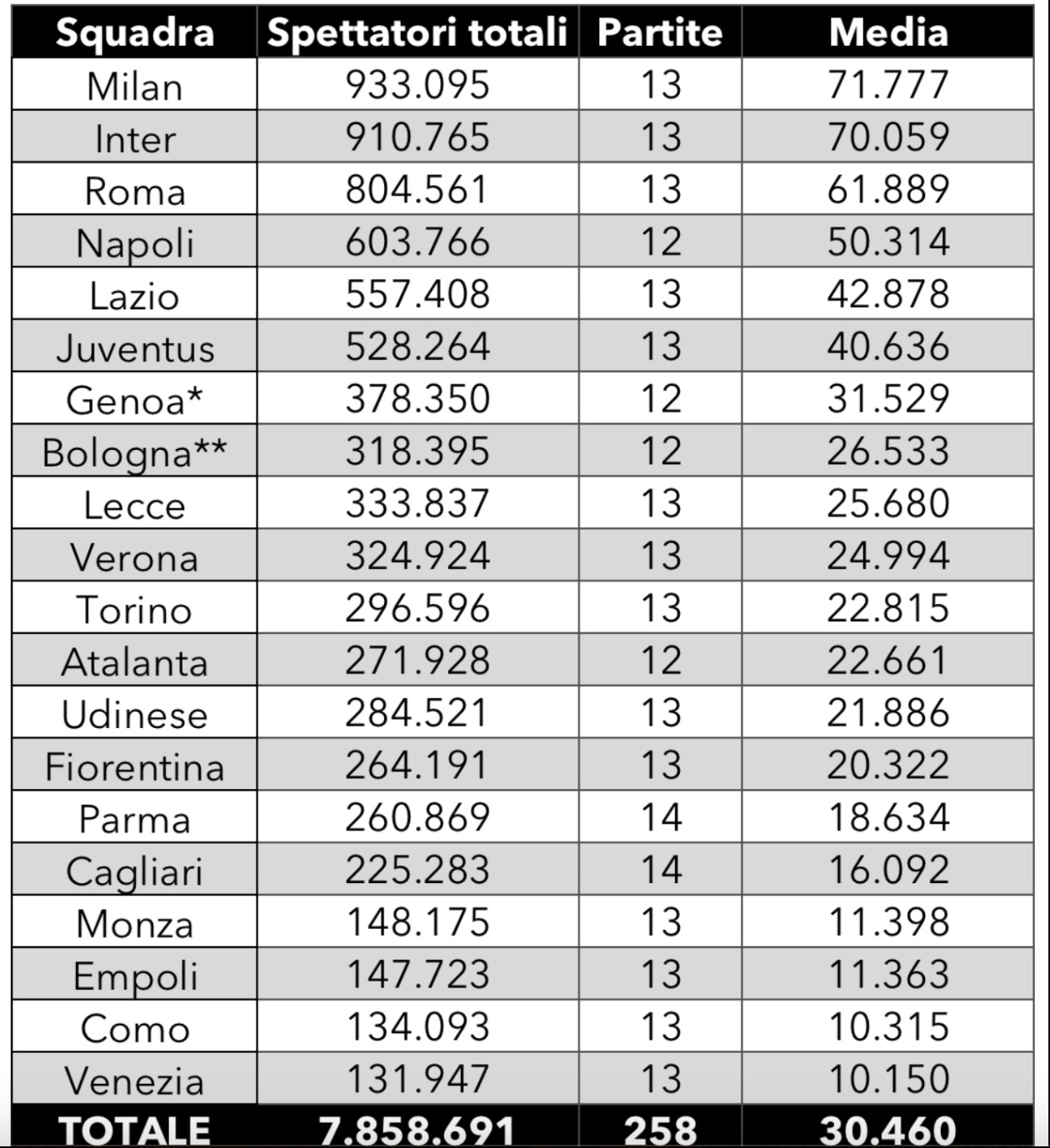 Questa la classifica che comprende tutti gli stadi di Serie A.