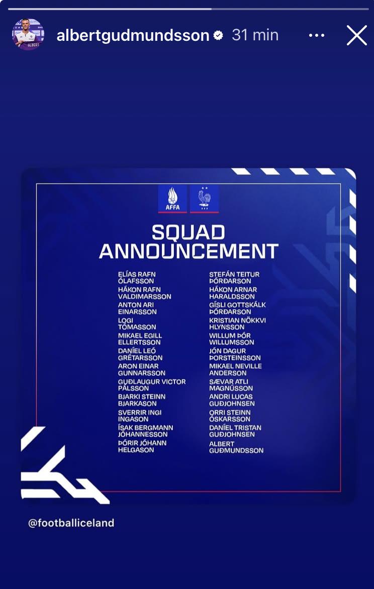 Albert Gudmundsson è stato convocato dall’Islanda per gli impegni contro Azerbaigian e Francia (5 e 9 settembre) validi per le qualificazioni ai Mondiali del 2026. L’attaccante della Fiorentina ha pubblicato una storia sul proprio profilo Instagram che mostra la lista diffusa dalla federazione islandese con anche il suo nome presente. Questa l’immagine originale: