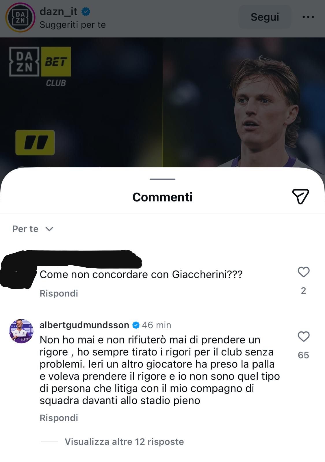 Gudmundsson invece, rispondendo ad un tifoso sotto ad un post Instagram di Dazn con il seguente virgolettato dell'ex giocatore e opinionista Emanuele Giaccherini: "Non se l'è sentita di calciare il rigore, questo deve preoccupare la Fiorentina. Sei pagato per prenderti le responsabilità", ha così commentato la vicenda: "Non ho mai e non rifiuterò mai di prendere un rigore , ho sempre tirato i rigori per il club senza problemi. Ieri un altro giocatore ha preso la palla e voleva prendere il rigore e io non sono quel tipo di persona che litiga con il mio compagno di squadra davanti allo stadio pieno".