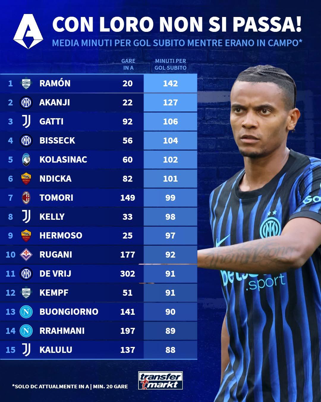 I difensori con la miglior media di gol subiti in A: domina Ramon, Rugani 10°