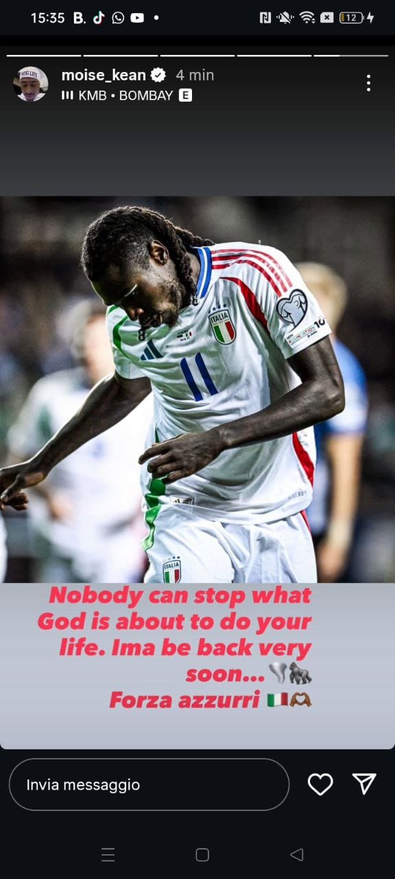 Kean rassicura tutti su Instagram: "Tornerò molto presto, forza azzurri"