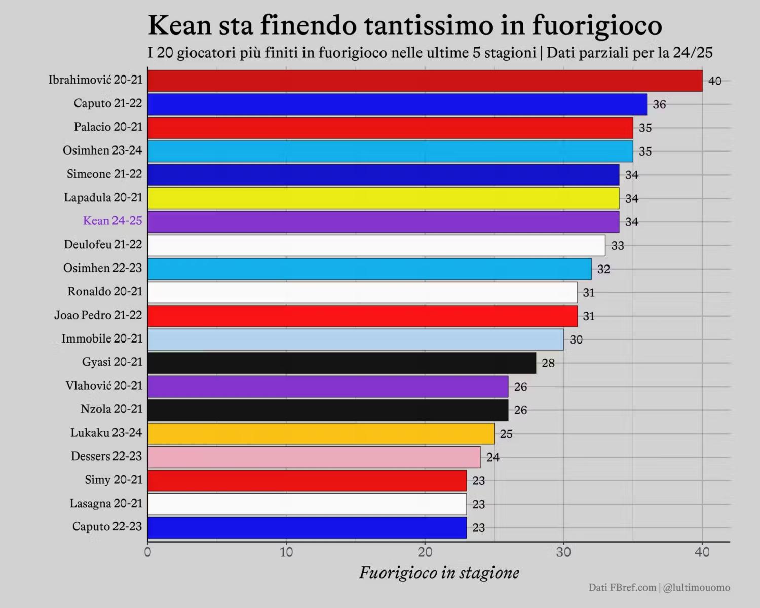- Kean fino a questo momento è infatti finito in fuorigioco per ben 34 volte (ben più del doppio dei “secondi classificati” Lookman e Dovbyk a 15), con una media di 2,19 ogni 90 minuti: un'enormità.Per dare idea dell’eccezionalità del numero: nel grafico qui sopra sono raffigurati i 20 giocatori che si sono visti alzare la bandierina più volte nelle ultime 5 stagioni di Serie A. I dati di tutti i calciatori coinvolti si riferiscono alla stagione intera, mentre a Kean è bastata metà per arrivare quarto a pari merito con Lapadula (stagione 21/22) e Simeone (20/21), a soli -6 dai 40 di Ibrahimovic (sempre 20/21) - scrive l'Ultimo Uomo.
