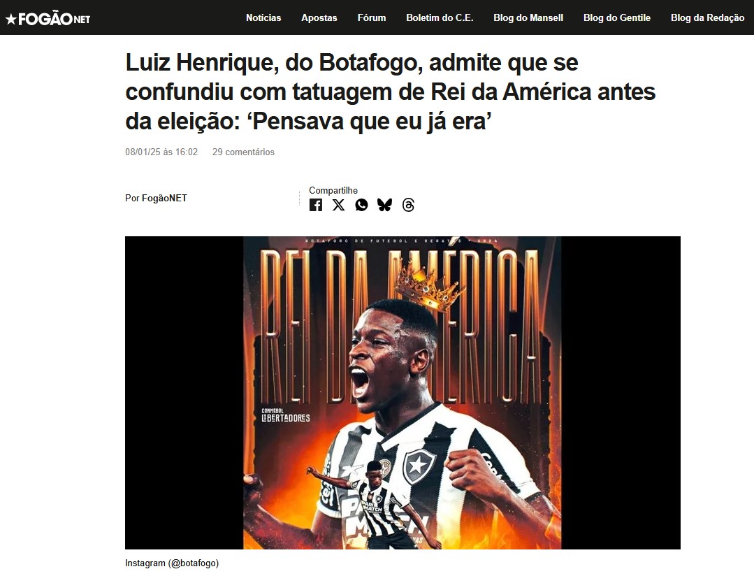 A pochi giorni dal premio "Pallone d'oro" che lo ha eletto miglior giocatore del Sudamerica, l'attaccante del Botafogo Luiz Henrique - obiettivo di mercato della Fiorentina per gennaio - ha rilasciato un'intervista al quotidiano Ovación, non nascondendo tutta la sua felicità per il titolo vinto: "Quando al termine della finale della Libertadores dissero che ero il migliore della partita, pensavo già di essere il migliore d'America. Quindi mi sono fatto il tatuaggio commemorativo… poi i miei amici che lavorano con me mi hanno detto che non ero ancora stato eletto "Re d'America" (ride). Ma il tatuaggio era già fatto, non c'era più niente da fare. Nel mio cuore e nella mia testa sapevo che sarei stato il Re d'America" ha detto il classe 2001 che poi ha aggiunto: "Stavo viaggiando con la mia fidanzata, ero per strada, i miei amici e la mia famiglia mi hanno mandato un messaggio dicendo che ero diventato davvero il re d'America. Ero molto felice di competere con un giocatore come Messi, per me il migliore al mondo. Sono un giocatore che gioca in Brasile, Messi gioca a calcio da tanto tempo, gareggia per tante cose. Sono stato molto felice di vincere questo premio. È stato un grandissimo onore. Significa molto perché voglio vincere sempre". Infine un sogno per il 2025: "Mi piace giocare sotto pressione, con tifosi rivali, è bello, posso dimostrare di più il mio calcio: posso far vedere che sono un giocatore di alto livello. Il nuovo anno? Spero che sia meglio del 2024. Per migliorare ogni anno e per essere sempre ad alto livello, bisogna giocare sempre in squadre di alto livello".