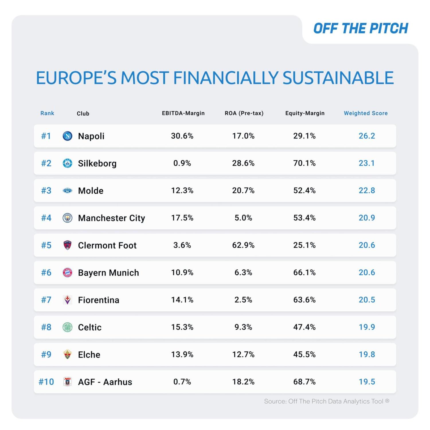 Come nel 2024, Napoli e Fiorentina si confermano nella top 10 dei club più sostenibili d'Europa stilata da Off The Pitch. Quest'ultima è una piattaforma di informazione e analisi verticale sul mondo del calcio, che si basa su tre indicatori economico-finanziari per calcolare la classifica. La classifica si basa sui dati degli ultimi tre bilanci, con maggiore importanza data a quello più recente. I tre indicatori utilizzati sono i seguenti: il Margine sul capitale proprio, che calcola il rapporto tra il risultato netto - utile o perdita e - e il capitale proprio; il Rendimento degli attivi, che misura il profitto generato dalla singola azienda per ogni euro di attivo posseduto; il Margine EBITDA, cioè la percentuale dei guadagni dell'azienda rispetto al fatturato. In questa speciale classifica il Napoli è primo, seguito sul podio dal Silkeborg e dal Molde mentre la Fiorentina è settima, dietro solo alle prime tre già citate e a Manchester City, Clermont Foot e Bayern Monaco.