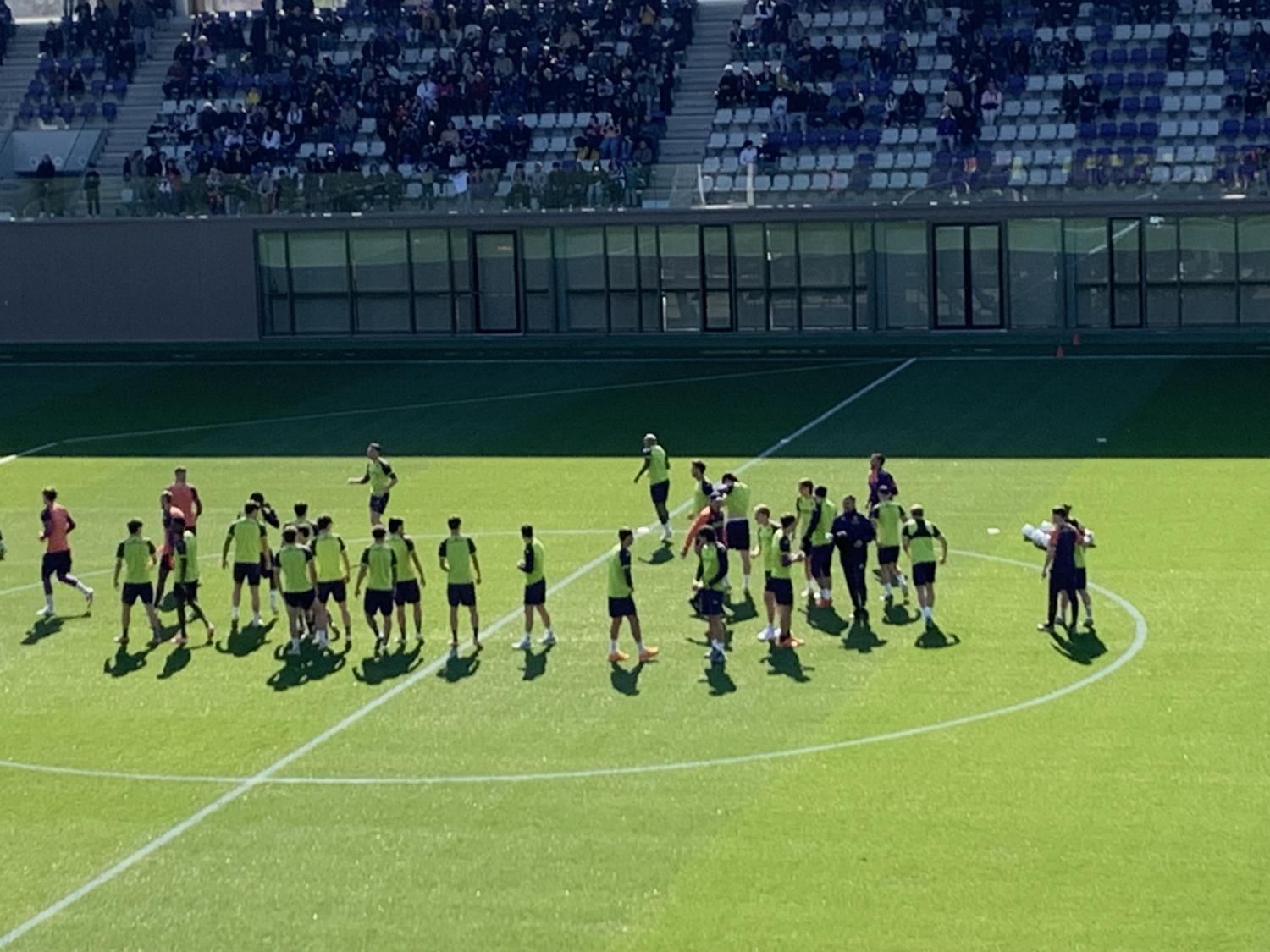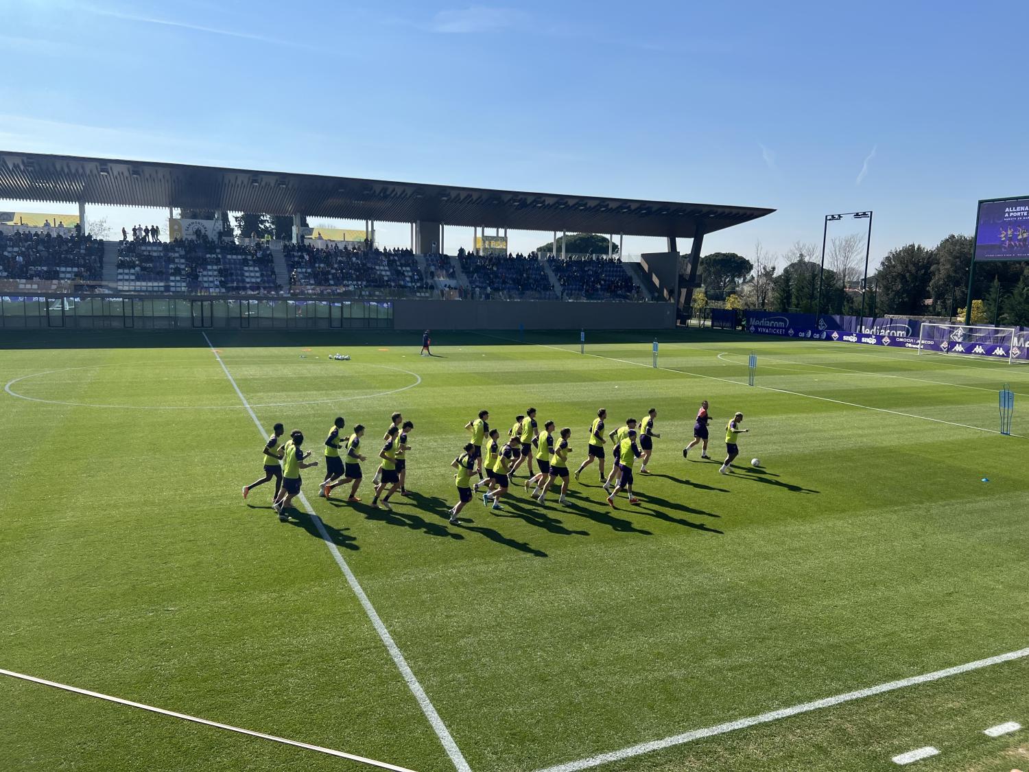 Le immagini dell'arrivo della squadra al Viola Park e dell'ingresso in campo
