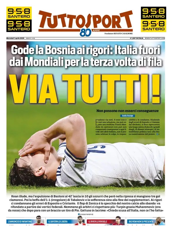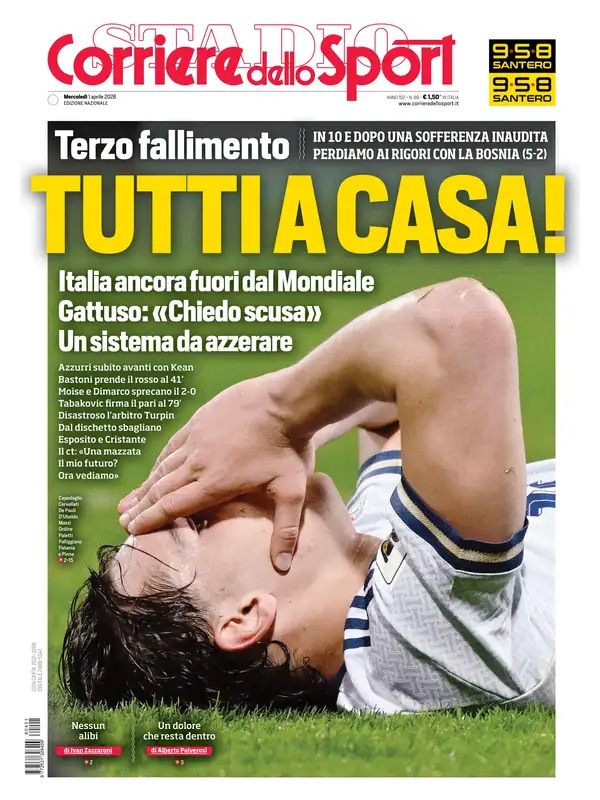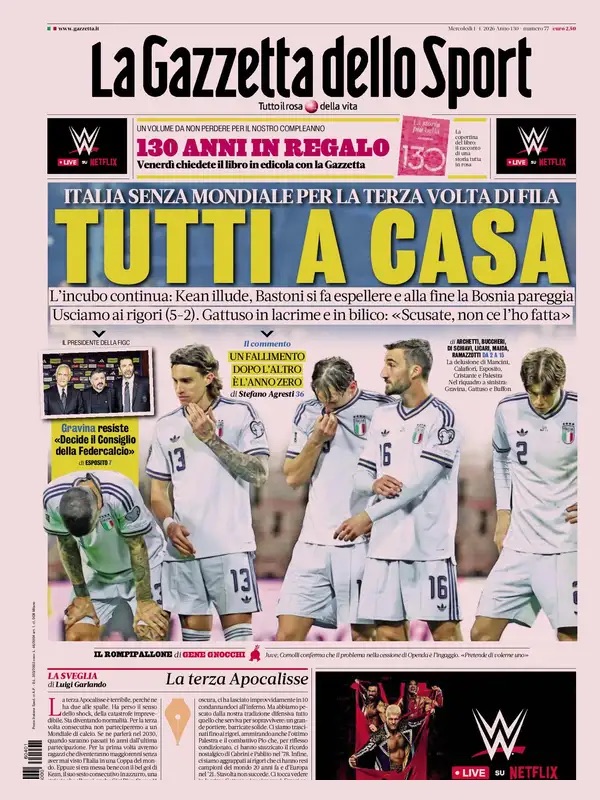 Corriere dello Sport, Gazzetta dello Sport, Tuttosport. I tre più importanti quotidiani sportivi nazionali aprono col medesimo titolo in prima pagina: "Tutti a casa". Il riferimento va ovviamente al fragoroso fallimento della Nazionale Italiana, che per la terza volta consecutiva è costretta a saltare il Mondiale. All'indomani di una delle più grosse delusioni sportive della storia di questo paese non c'è spazio per altro, solo per un titolo a caratteri cubitali che è il medesimo per tutti, sullo sfondo gli sguardi persi dei calciatori sul campo di Zenica. L'Italiia, in vantaggio col gol di Moise Kean e poi in dieci contro undici per un tempo e mezzo a causa dell'espulsione di Alessandro Bastoni, dopo essersi fatta agguantare dalla Bosnia (gol di Tabakovic in mischia), per poi capitolare ai rigori. Lo psicodramma azzurro tocca tutte le latitudini e diventa una sconfitta epocale: l'Equipe titola "L'Italie encore a terre" (L'Italia ancora a terra) con in prima pagina il volto di uno sconsolato Gigio Donnarumma, Marca scrive, sempre in prima "Tercer fracaso Mundial" (terzo 'fracasso' Mondiale). E' un giorno che è destinato a entrare nella storia del calcio italiano, ancora una volta, sulla pagina sbagliata del libro.