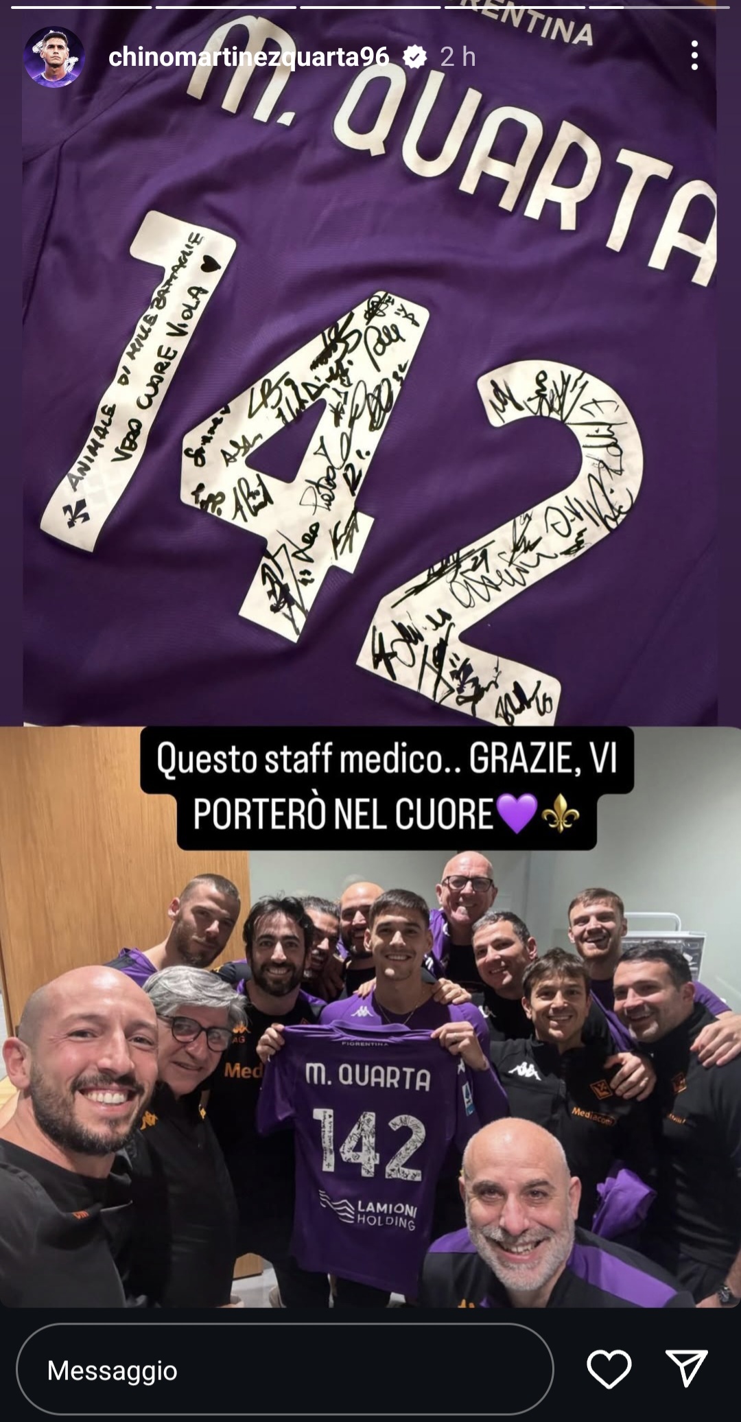 Dopo il saluto tramite un post Instagram a tutta la città di Firenze e ai tifosi della Fiorentina (QUI la news completa), Lucas Martinez Quarta ha voluto salutare anche lo staff medico gigliato. Lo ha fatto, sempre sui social, con una storia Instagram particolare. Nell'immagine infatti si può notare che El Chino, insieme a De Gea, Beltran e tutto lo staff medico gigliato, sta tenedo in mano una maglia con il numero 142, ovvero le presenze totali dell'argentino in maglia viola. La maglia, con la speciale dedica "Animale di mille battaglie. Vero cuore viola" è un regalo dello staff a Quarta che ringrazia scrivendo: "Grazie, vi porterò sempre nel cuore". Di seguito la storia Instagram di Martinez Quarta: