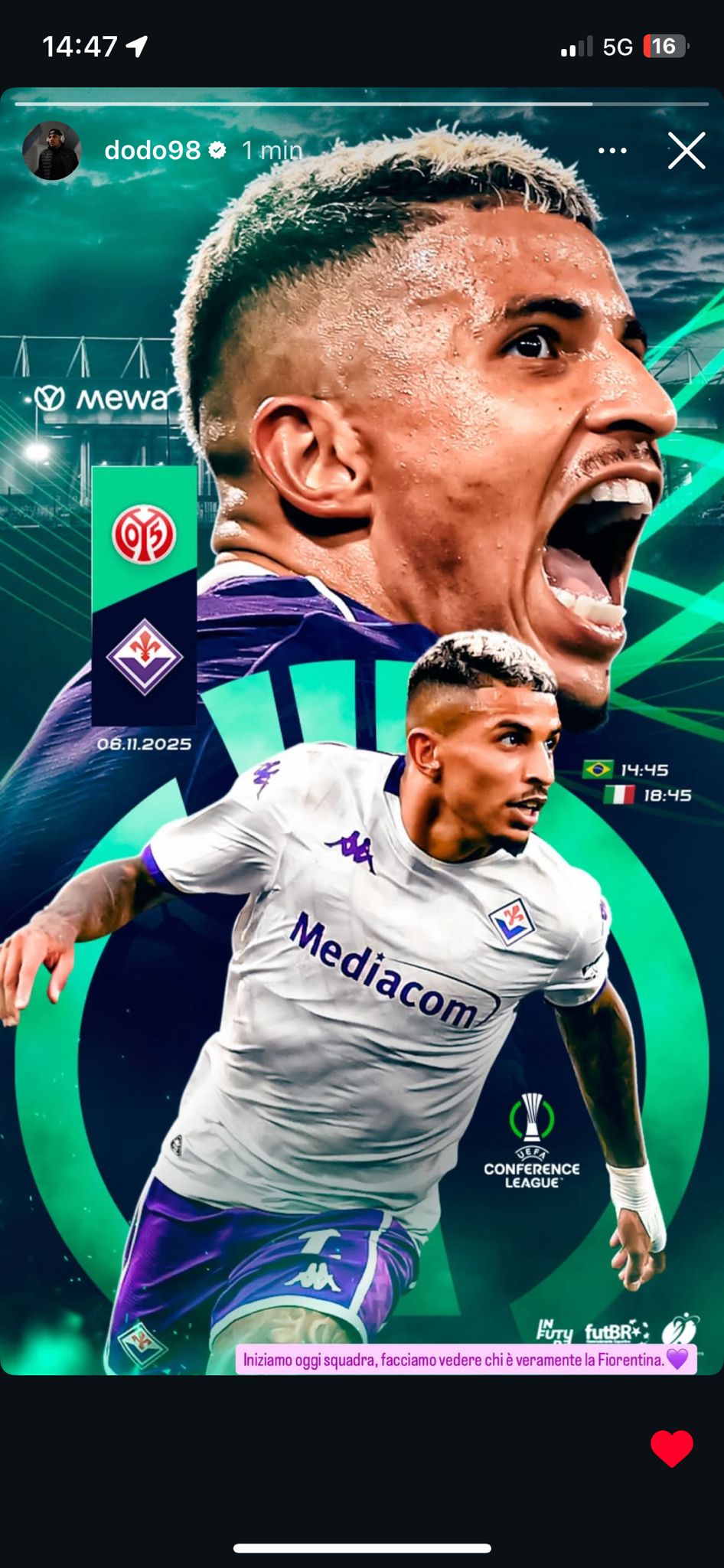 La Fiorentina si appresta a sfidare il Mainz presso la Mewa Arena, stasera per la terza giornata del maxi girone di Conference League. Per la squadra viola è una sorta di ripartenza, dopo l'addio travagliato con Stefano Pioli e una gestione che non è mai decollata. Sulla panchina ci sarà il tecnico ad interim Daniele Galloppa e i giocatori sono vogliosi di riscattare una prima parte di stagione decisamente da dimenticare. In questa direzione va anche il messaggio via social di Dodo, che poco fa ha postato una Storia su Instagram con scritto: "Iniziamo oggi squadra, facciamo vedere chi è veramente la Fiorentina!", con tanto di cuore viola a seguire. Qua sotto l'immagine: