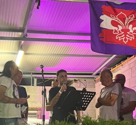 Lo storico gruppo del Cav Valdarno insieme all'Associazione SoloViola, sabato sera ha dato vita a una grande festa a Bucine non solo con l'intento di passare una serata a completa tinta viola, ma anche e soprattutto per raccogliere fondi per una causa che ha colpito il cuore di tutti i presenti. La 5a edizione della Festa Viola del Valdarno aveva come obiettivo quello di cedere l'intero incasso della serata per contribuire all'acquisto di una carrozzina speciale per un bambino nato con una gravissima malformazione congenita che vive con la sua famiglia proprio nel Valdarno. Obiettivo raggiunto in pieno, con la partecipazione di tantissimi tifosi e ultras, spesso denominazione accostata ai tifosi in senso negativo che questa sera, come in tante altre occasioni, ha dato sfoggio di grande generosità e solidarietà. I tanti storici rappresentanti della curva Fiesole presenti insieme alle nuove leve del tifo organizzato hanno permesso di raggiungere un incasso totale di 12 mila euro. Per coprire l'intero costo della carrozzina mancavano però ancora 4 mila euro, donati dalla Joe Barone Foundation, presente alla festa con il figlio del compianto dirigente della Fiorentina, Giuseppe (in foto).