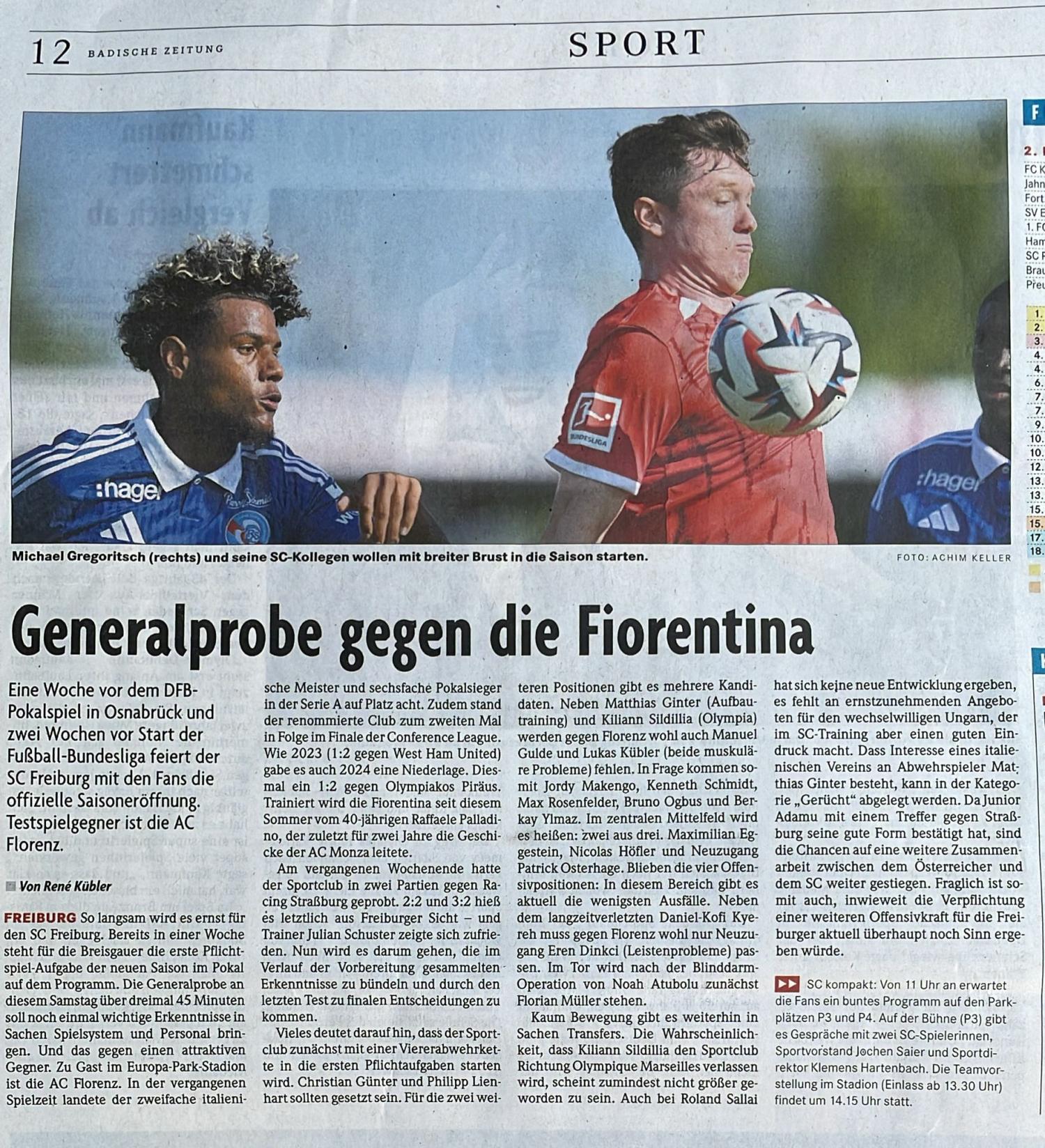 Il principale giornale di Friburgo, il Badidche Zeitung, stamani in edicola introduce la partita con la Fiorentina (ore 15:30) con il titolo: “Prova generale contro la Fiorentina: a una settimana dalla gara di coppa contro l’Osnabrück e a due settimane dal debutto in Bundesliga, il Friburgo affronta in un testo affascinante la squadra di Firenze”.