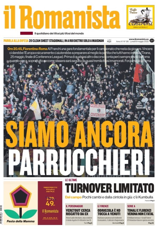 "Siamo ancora parrucchieri". Titola così in prima pagina Il Romanista, analizzando la partita che questa sera attende la Roma in casa della Fiorentina e rifacendosi al celebre striscione giallorosso del 9 aprile 2001 per una sfida anch'essa disputata di lunedì. Quella di stasera è una gara fondamentale per i giallorossi, che metterebbero le mani sull'Europa in caso di successo e saranno seguiti da quasi 3000 tifosi.